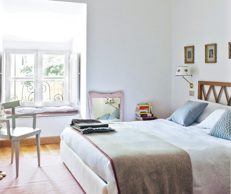 La camera da letto, luminosissima, è molto sobria e intima e gioca con le tonalità pastello, scaldate dal pavimento in rovere e dalla testiera del letto più i comodini, che i padroni di casa hanno portato dalla casa di campagna. Il rosa di tappeto e specchio gioca con il beige del plaid e il grigio materico dei cuscini. Il tocco décor? I paralumi con palme e animali multicolor e il cuscino sul davanzale della finestra che, così, si trasforma in una romantica panca per leggere e ‘sbirciare’ il passaggio in piazza.