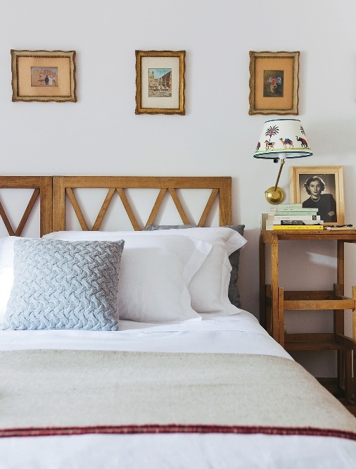 Il letto è formato dal sommier e dalla testata in legno, recuperata come i comodini. È vestito con la parure di lenzuola della collezione Blow in lino [Fazzini da €219] e con la morbida coperta in lana merino Serena [Teixidors, in vendita da Magazzini Associati, cm 140x180 €244]. Lo completano i cuscini in lana intrecciata [da Magazzini Associati, cm 50x50 €55], le lampade da parete con paralumi dal decoro a tema esotico [da Lisa Corti], i quadretti e una foto ritratto opera dell’artista Ghergo in cornici vintage.
