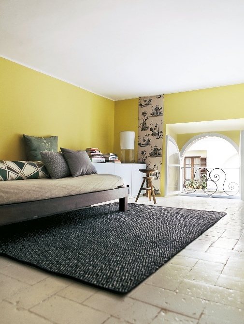 In fondo alla casa c’era una stanza posta a un livello più alto e raggiungibile da una scala: Martino e Livia hanno deciso che sarebbe stata uno studio-camera degli ospiti e che si sarebbe dovuta distinguere dal resto dell’appartamento. Per questo il pavimento in cotto, molto rovinato, è stato dipinto di bianco con una vernice protettiva e le pareti in un avvolgente giallo senape, cui sono stati coordinati i tessili che variano dal beige, al marrone pepe, al verde.