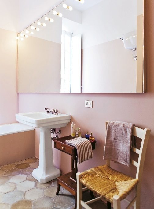 Anche prima i bagni erano due, ma quello piccolo risultava quasi inutilizzabile perché largo soltanto 80 cm. Così Martino ha deciso di spostare di 50 cm la parete che li separava, in modo da ricavare due ambienti molto più funzionali. In una fabbrica dismessa in periferia, poi, ha scovato delle piastrelle esagonali in cemento e i maxi specchi minimali: per armonizzarli tra loro ha pensato di dipingere di rosa cipria muri e termosifoni e di installare sanitari dal look classico, ai quali abbinare pezzi vintage e porte bugnate lasciate volutamente grezze.