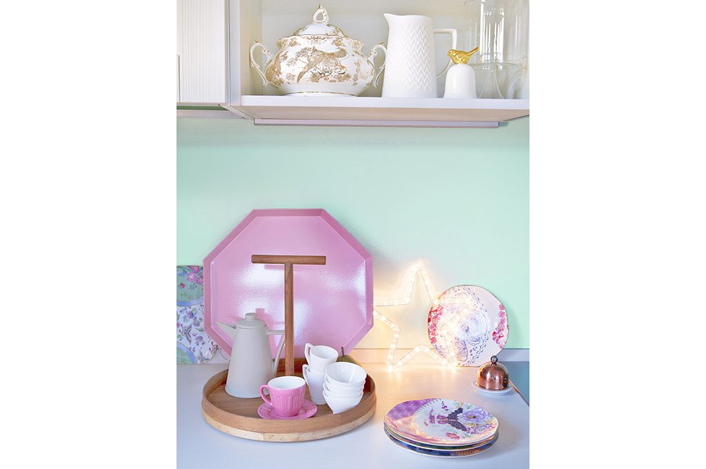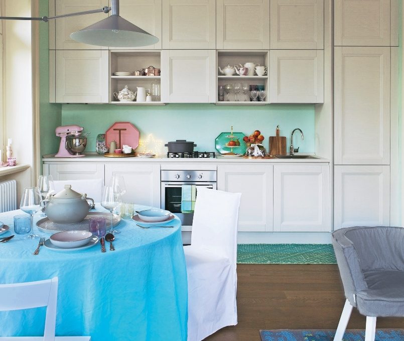 Sulla tovaglia in tessuto di lino Saraille-Aqua [Designers Guild] piatti Raffaello in rosa e azzurro, zuppiera e vassoio [Ceramiche Bucci], posate Copper matt [Bitossi Home], bicchieri colorati da acqua [Lsa International], calici da vino [Villeroy & Boch]. Tappeto verde menta [Ilaria I.]. Cucina Vintage Oyster [Veneta Cucine].