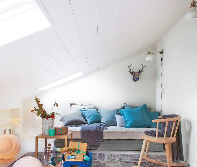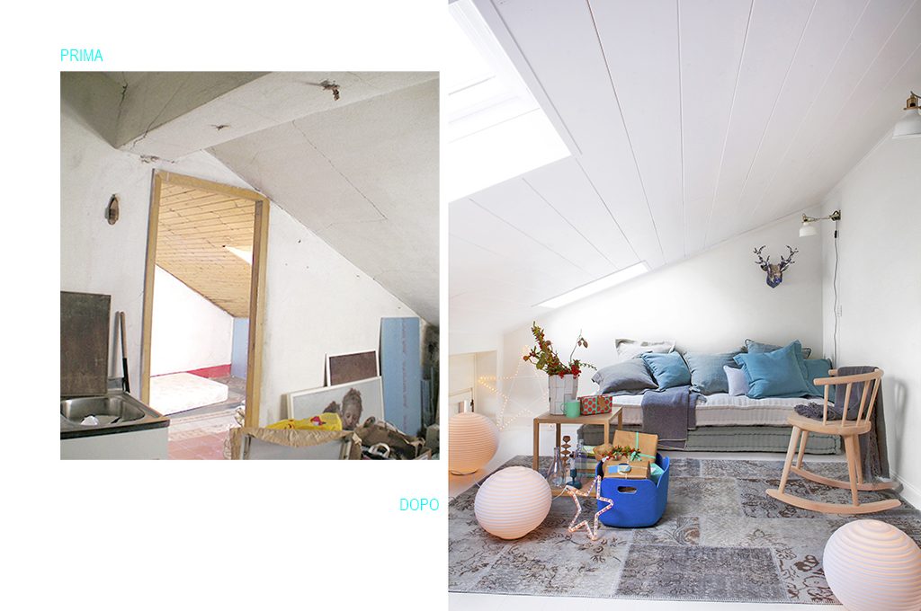 La camera doveva essere un nido. Un letto dalla testiera avvolgente, che crea un’atmosfera protettiva e accogliente. E per dargli risalto è stato scelto una tappezzeria a tema classico (floreale) ma rivisitato in chiave moderna e grafica. La stanza contiene anche una zona lettura-relax e un piccolo angolo studio. Dalla scala condominiale si raggiunge la mansarda: una sorta di dépendance totalmente autonoma. Qui il pavimento è in legno chiaro, in più, pareti e soffitto sono dipinti di bianco: questo mood ha ispirato uno stile di impronta nordica. La palette di colori vira dal grigio all’azzurro polvere, perfetti con il calore del rovere dei mobili.