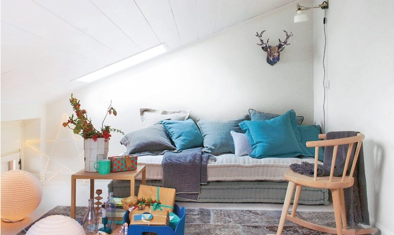 Divano formato da due materassi trapuntati [Twils cm 80x190]. Sedia a dondolo W 608 [Billiani], tappeto patchwork Antalya [Sitap, cm 170x240], lampade sfera [Rotaliana], tavolino [Plinio il Giovane] e cesto blu [Muuto].