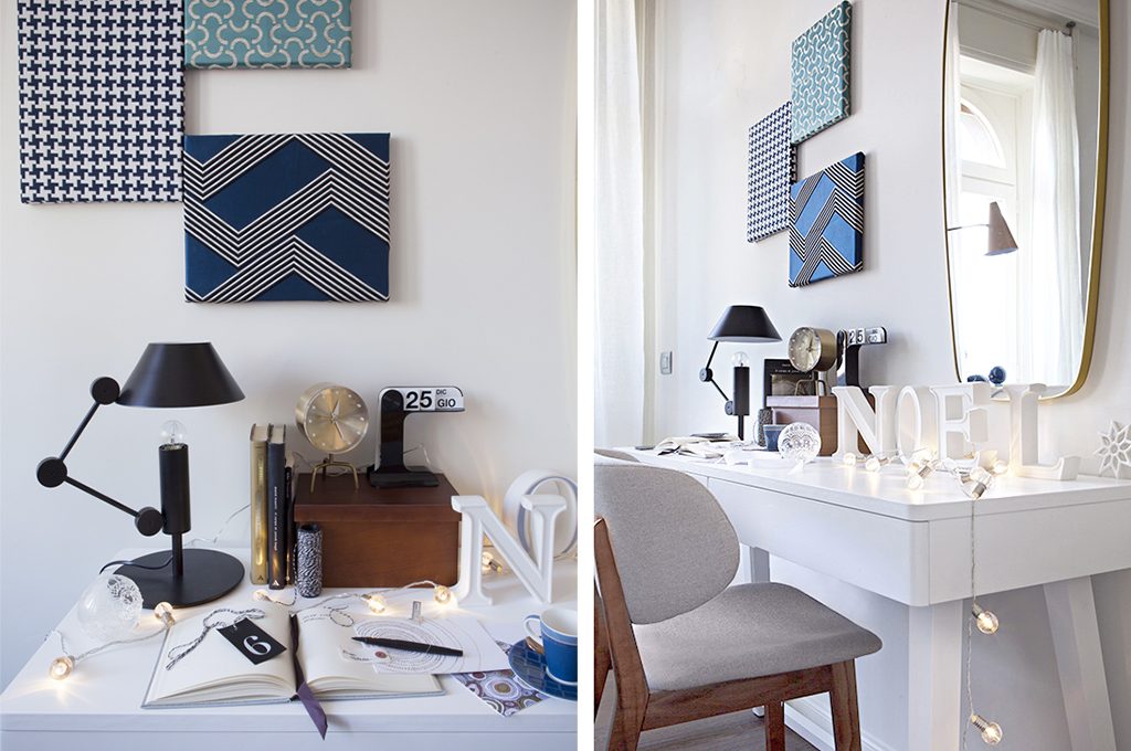 Libreria Totem [Plinio il Giovane]. Trofeo in mdf [Miho Unespected].Tavolo in rovere [Coin], sedute Amelie in pelle azzurra [Calligaris]. Abat-jour Costanzina [Luceplan]. Piattini con lettere Ilaria Innocenti. Vaso in lamiera [Antonio Sciortino].
