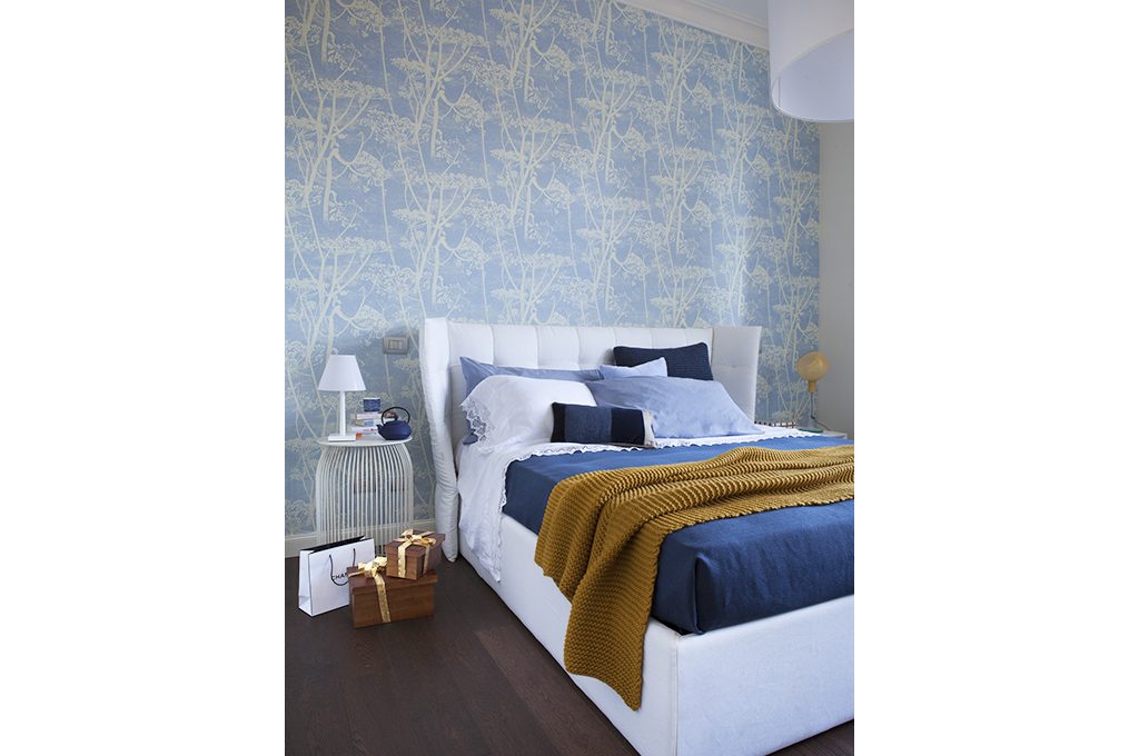 Letto contenitore Force Plus T [Oggioni, cm 188x206x 113h], lenzuola Nuvola [Fazzini] più federe in cotone [Coin]. Cuscino blu e plaid senape [Doimo Decor], cuscini [Zara Home, L’Opificio]; copriletto in tessuto blu Nido [Dedar, cm 140h]. Comodino Turi Turi [Antonino Sciortino] con abat-jour Dina [Rotaliana], teiera [Zara Home]. Scatole in legno [Coin]. Sul comodino di destra, lampada Parola [FontanaArte].