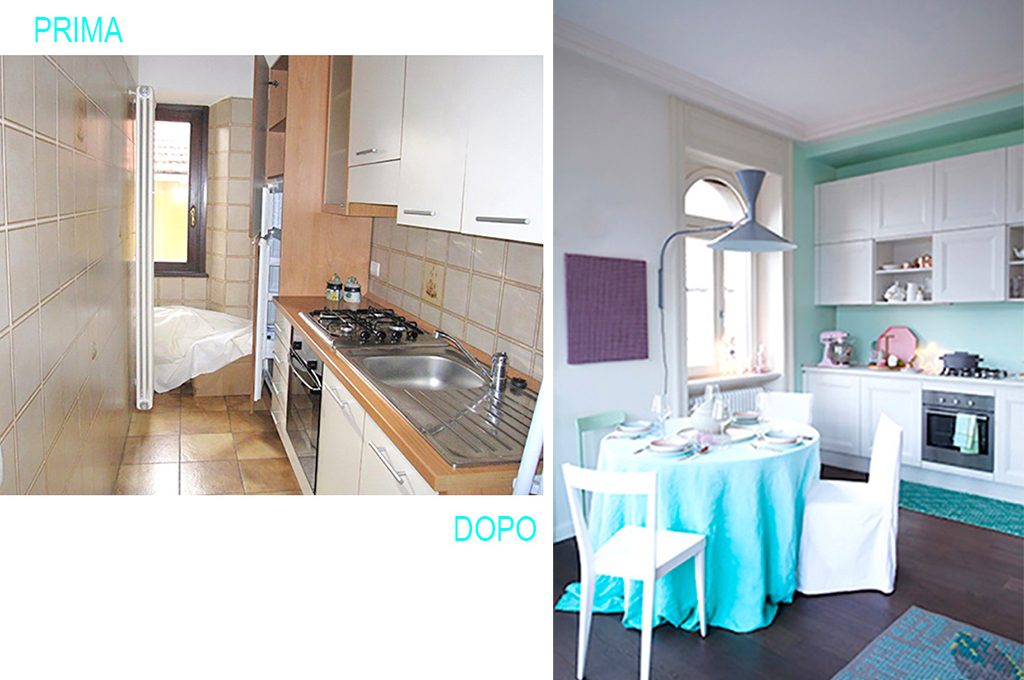 La cucina, prima, era separata dal soggiorno ma ciò rendeva il tutto un po’ angusto e cupo, oggi ha diventata parte del living. È stato scelto un modello di cucina dallo stile ‘neo-vintage’ molto leggero con ante a cornice e vani a giorno. Il tutto, ovviamente bianco in modo che spiccasse sulla parete colorata in verde menta. Sempre in tonalità pastello e in spirito d’antan i vari accessori da tavola, decisamente declinati al femminile.