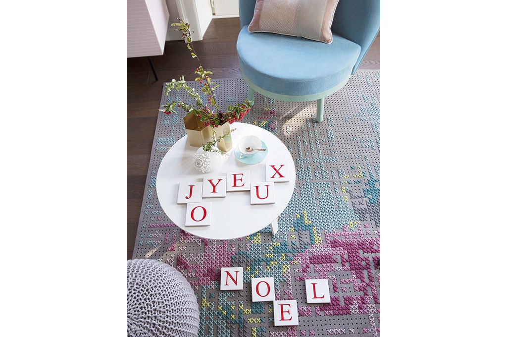 Tappeto in feltro Canevas [Gandia Blasco, cm 170x 240], poltrona Demi Paltò [L’Abbate]. Coffee table Bella [Hay], pouf [Coin], oggetti Ferm Living, Made a Mano e Wedgwood.