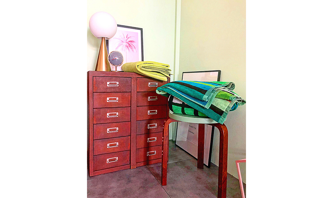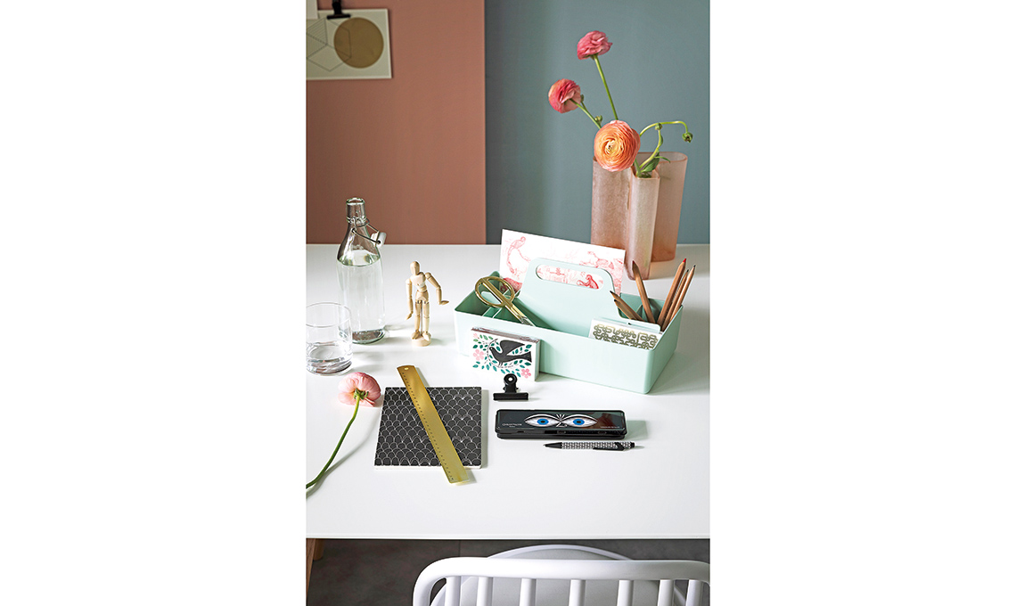 Portaoggetti Toolbox [€34,20], penna Caran D’Ache 849 Alexander Girard [€49] e fiammiferi Dove [€6,90], tutto [Vitra]. Vaso rosa