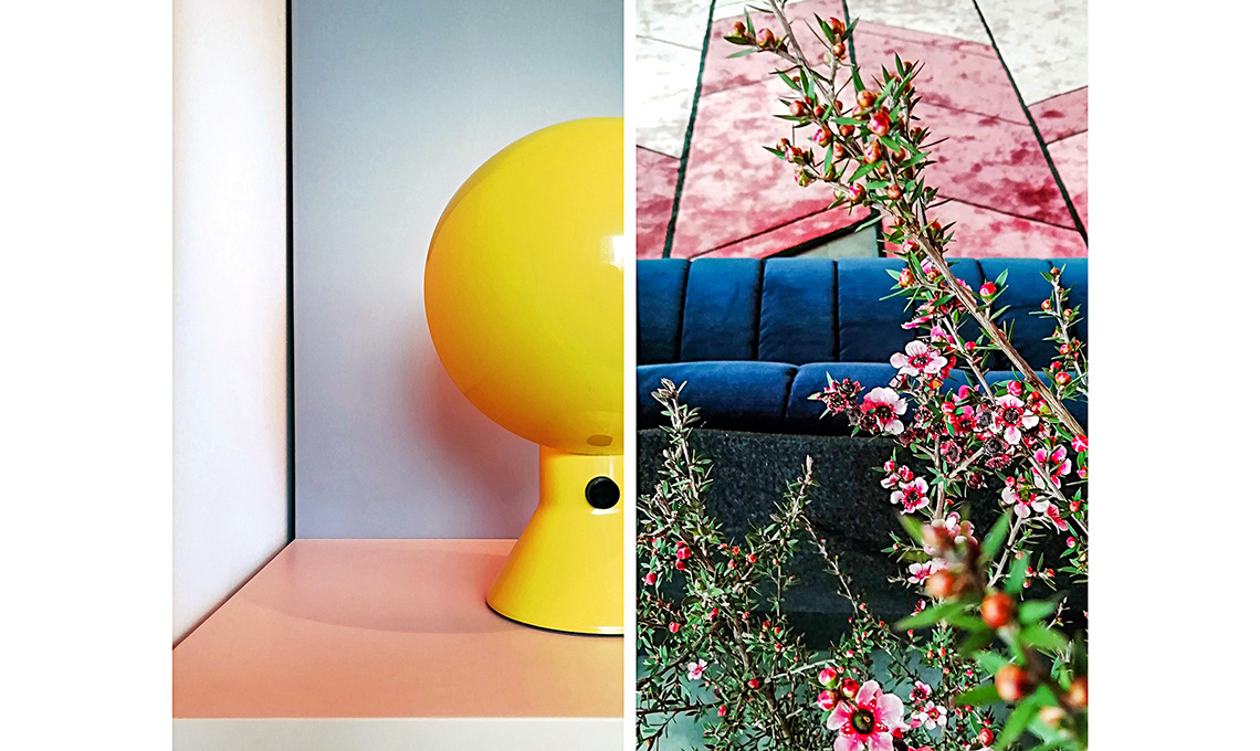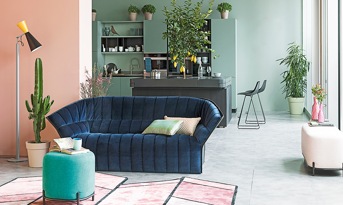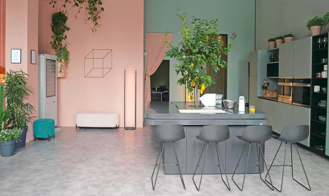 Il colore è Peach di [Wilson & Morris], un rosa tendente al terracotta che si sposa col giallo. Divano Moel 2, design di Inga Sempé [Ligne Roset, cm 155x89x81h €4.339], pouf smeraldo Ego U01 e panchetta rosa Ego H01 [Kestile €144,90 e €319,90], mug della linea Crema Shine [Tescoma, ø cm 8x9,5h €4,90], lampada da terra Parliament disegnata da Le Corbusier [Nemo €994,30]. Sullo sfondo, attorno all’isola, sgabelli Miunn con finitura nera a poro aperto [Lapalma, cm 43x65x89h €341,60 cad]. piante di [Mati 1909 in collaborazione con Orticolario].