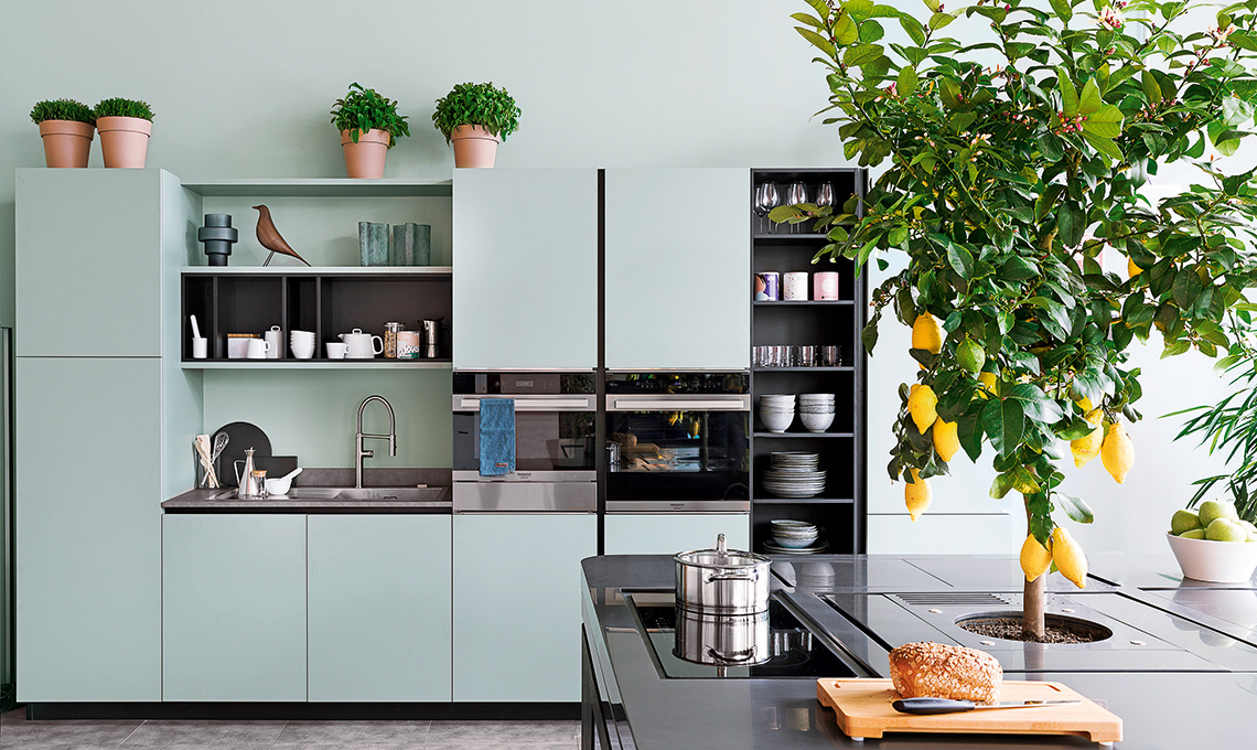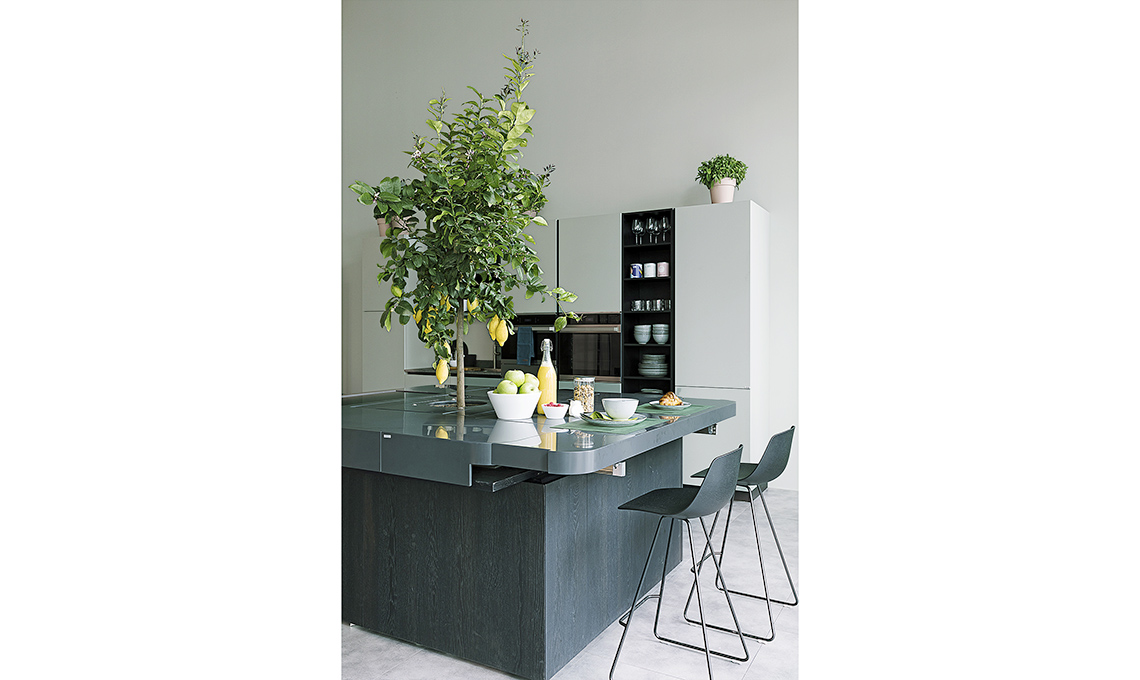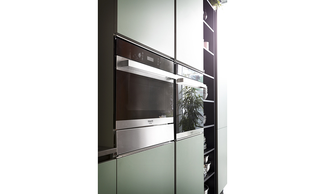 Isola cucina Oasi, disegnata da Stefano Boeri, basi e pensili LAB13 in versione LPL Oliva [ARAN Cucine]. Forno Active Steam 75 con 3 livelli di vapore combinati con le cotture tradizionali, microonde Class7. Tutto di [Hotpoint]. Il colore è Moss Green di [Wilson & Morris], un grigio-verde che si sposa bene con il rosa e il legno.