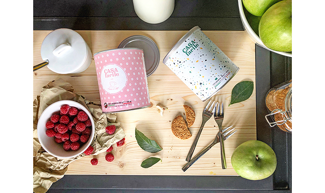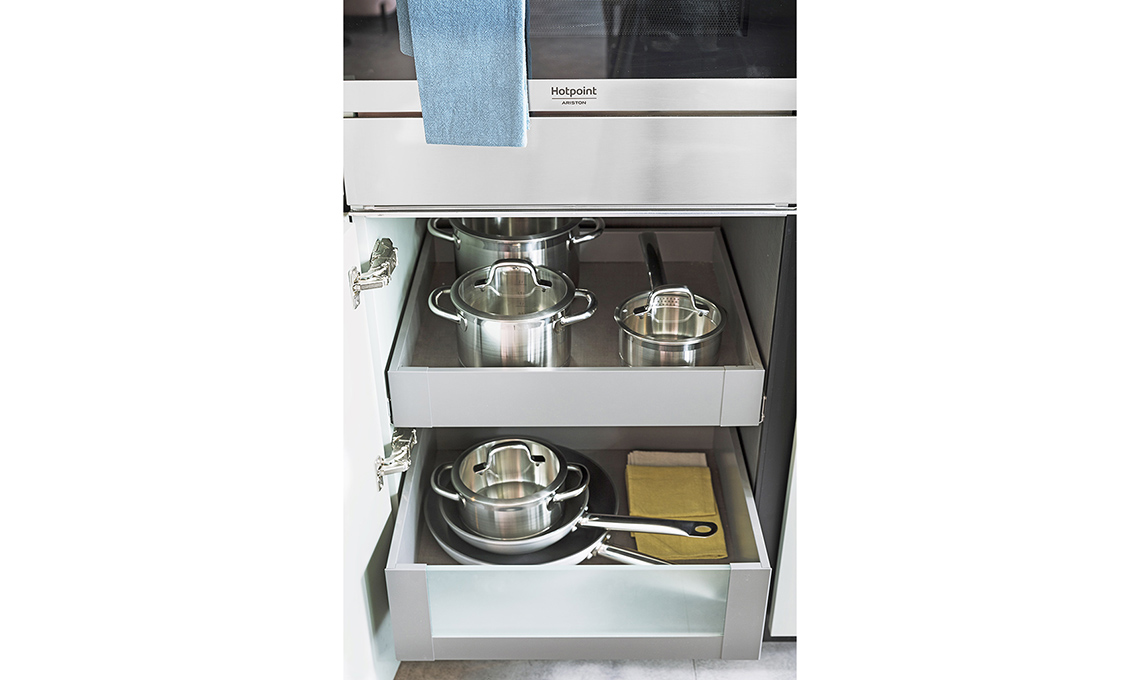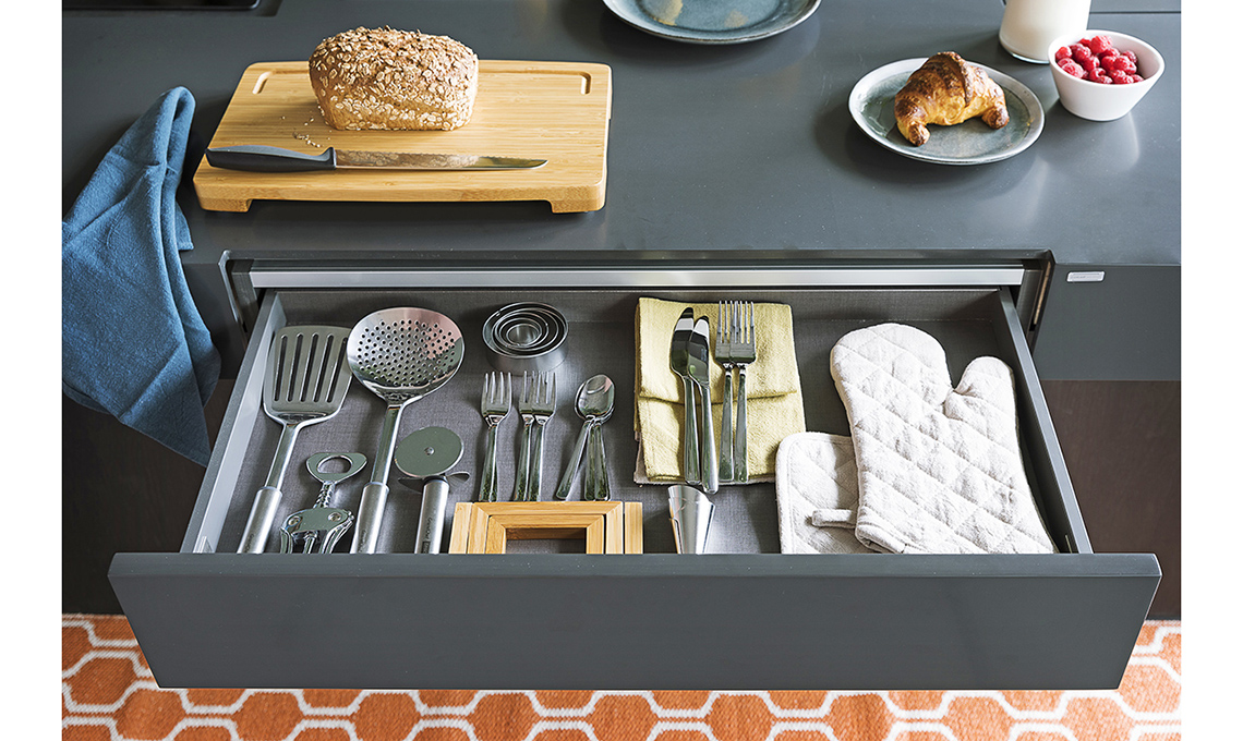 Sull’isola, colazione apparecchiata con piatti della nuova collezione Emotion [piatto piano €14,90, fondo €12,90, dessert €9,90], ciotole bianche della linea Gustito [da €5,90], barattolo in vetro con coperchio acciaio in varie misure [da €13,40], bottiglia [€3,90]. Nel cassetto: guanto da forno, presina e canovaccio linea Fancy Home, posate da tavola Victoria [€69,90 il set da 24 pz] e accessori vari. Tutto di [Tescoma].
