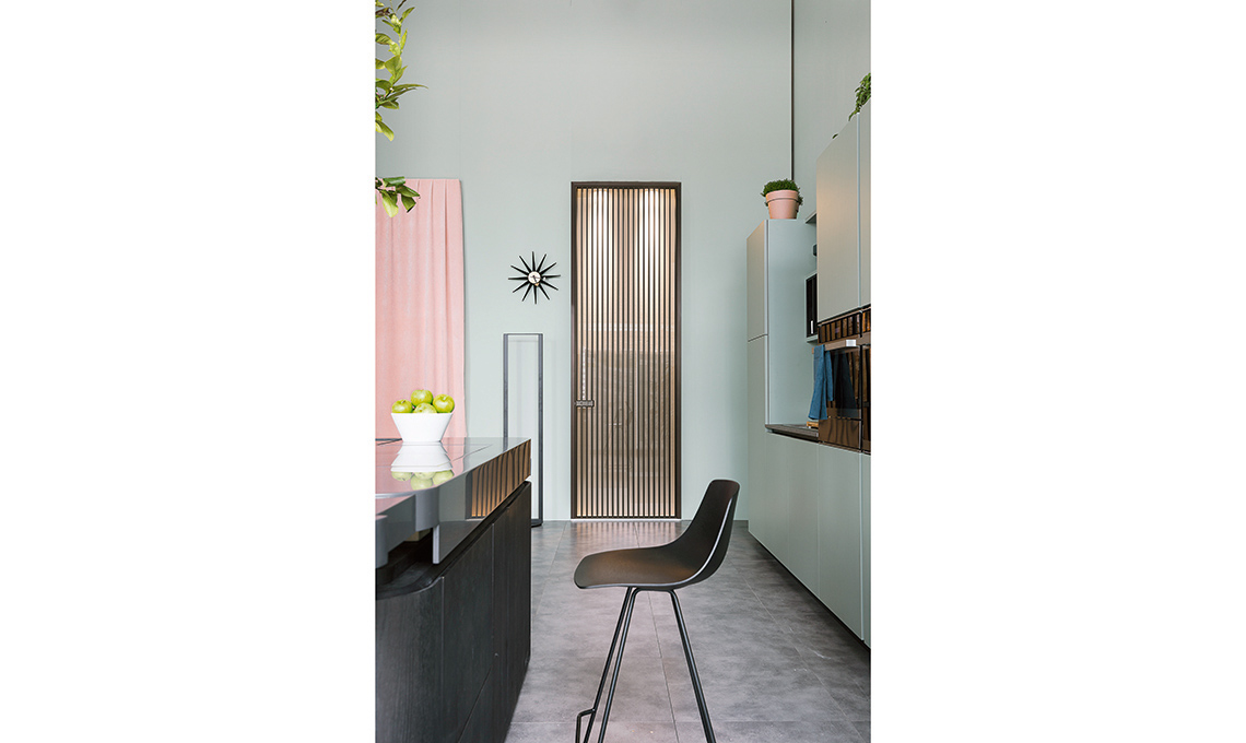 Porta G-Like Vert 1VV con profilo in alluminio anodizzato bronz e vetro bronzo [Gidea Gruppo Garofoli, cm 90x300h da €2.317], orologio Sunburst [Vitra, ø cm 47 €395], tenda in velluto Hôtel Particulier disponibile in 31 colori [Élitis, cm 140h prezzo su richiesta], lampada da terra Amadeus, linea Lookup [Gruppo Raina, cm 167h da €1.185].
