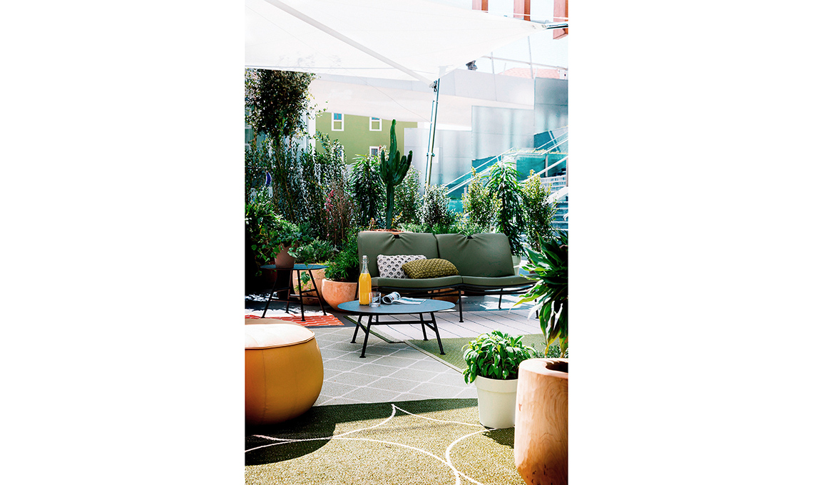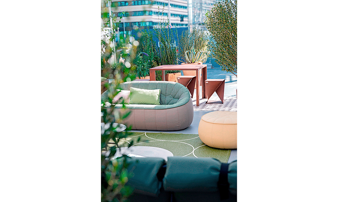 Divanetto [da €2.767] e pouf Ottoman [tutto Ligne Roset]. Tavolo Adranos e sgabelli Venere [Il Giardino di Corten €1.344 e €390]. vasi in legno di cedro [Lencanto], tappeti [Pappelina]. Piante [Mati 1909]