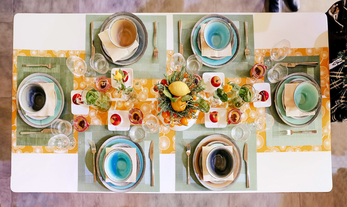 Vanessa Pisk ha allestito la tavola con un runner di carta da parati, un totem di ciotole con fiori e frutti e dei ‘giveaway’ dolci nei barattolini
