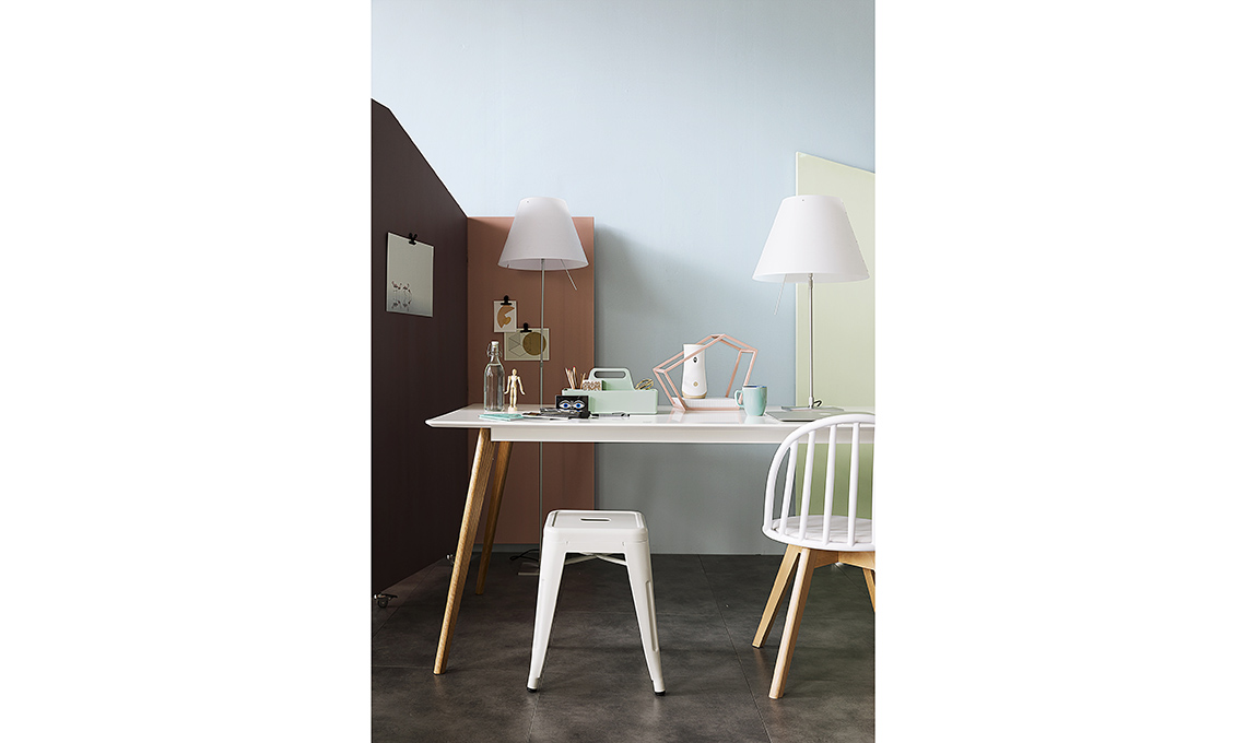 Il portaoggetti che si sposta facilmente altrove, il piano di lavoro che potrebbe essere anche un tavolo da pranzo, un’alternanza di sedute – alcune super confortevoli e altre rapide da spostare e moltiplicare – e due punti luce, uno da appoggio e uno da terra: ecco le idee che le nostre stylist hanno messo in pratica per raccontare i requisiti di un moderno angolo ufficio in casa.