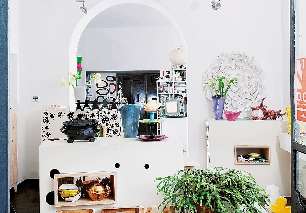 In un palazzo dei primi del ’900 nella periferia storica milanese, la tipica tipologia commerciale del negozio su strada con retro è stata trasformata in casa&bottega (come si diceva una volta) dagli architetti e designer Licia Martelli e Luca Maestri. Lei, architetto paesaggista, progetta giardini e terrazze, ma anche ceramiche in pezzi unici e piccole serie dalle forme leggere e dallo spirito ironico, che hanno il sapore del fatto a mano. Lui, creativo, bricoleur, esperto e collezionista di fumetti, progetta giochi di società. La bottega, un tempo rivendita di stracci e poi officina di un fabbro, ospita ora lo showroom di Licia: Ceramiche Libere. Uno spazio articolato con accesso e vetrina sulla strada, dietro c’è l’ufficio e a lato il soggiorno-studio, regno di Luca. In fondo, ampia cucina-pranzo e, sopra, il mini-soppalco-scultura, il letto e la cabina armadio.
