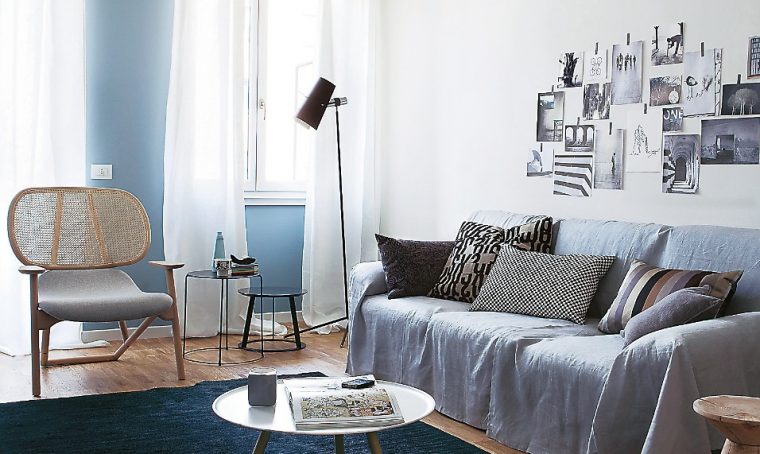 Il divano “comodoso” per accoccolarsi a leggere o a guardare la tv è di vecchia data, ma ancora valido, e rivestito di rosso acquista nuova vita; cuscini di Lis Carpenter. La lampada da terra è un pezzo Anni ‘70; i vari mobiletti in legno sono opera di Luca e sue sono anche le innumerevoli collezioni di fumetti ordinatamente allineate nelle librerie tutt’intorno. A parete, un vecchio manifesto di Mazinga contro gli Ufo Robot e una stampa su tela di Valentina, di Mycrom (cm 150x65h, €300).