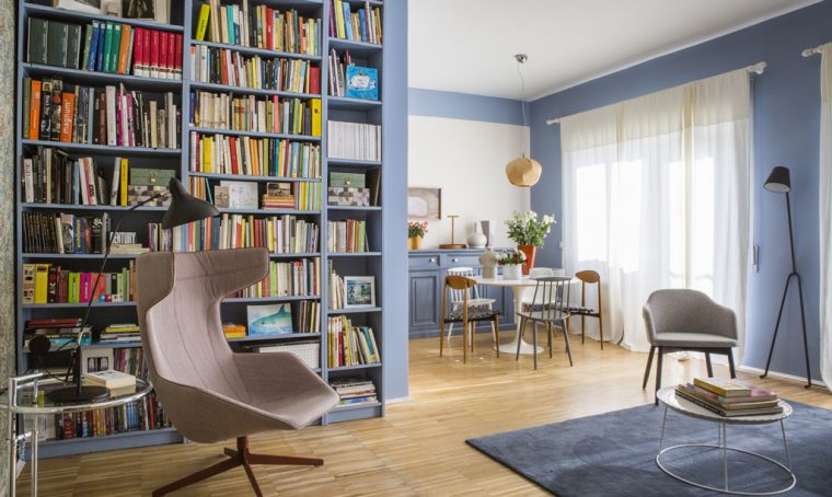 Le librerie in pino di Svezia Ivar di Ikea (€49,42 il modulo di cm 90x30x179h) rivestono quasi tutte le pareti del soggiorno. Accolgono infinite collezioni di fumetti, ma anche cassette, dvd e alcuni personaggi dei cartoon in gomma. Nella foto si vede anche il lungo tavolo che era da pranzo, usato ora come scrivania. La sagoma di cartone raffigura una signorina Anni ‘50 che fa pubblicità alle pellicole Ferrania.