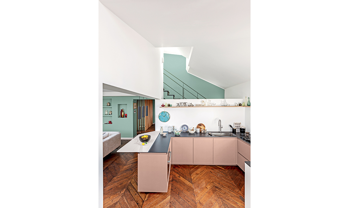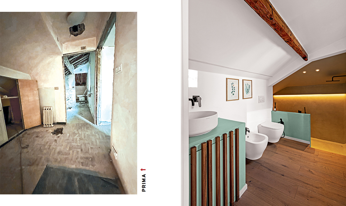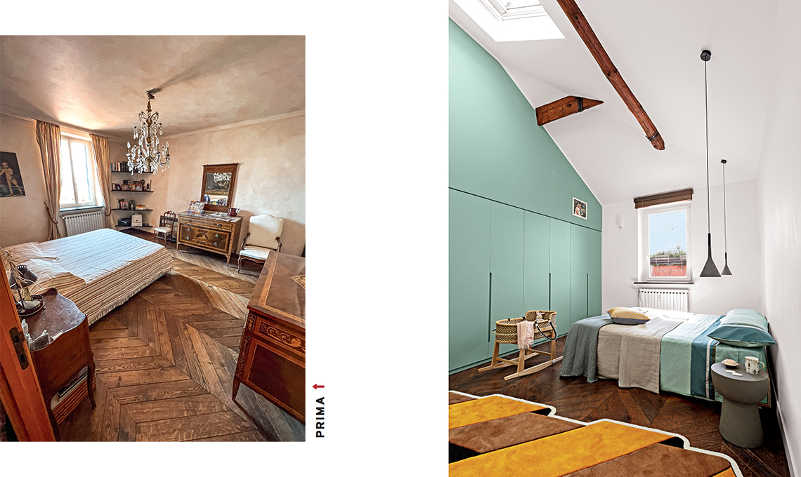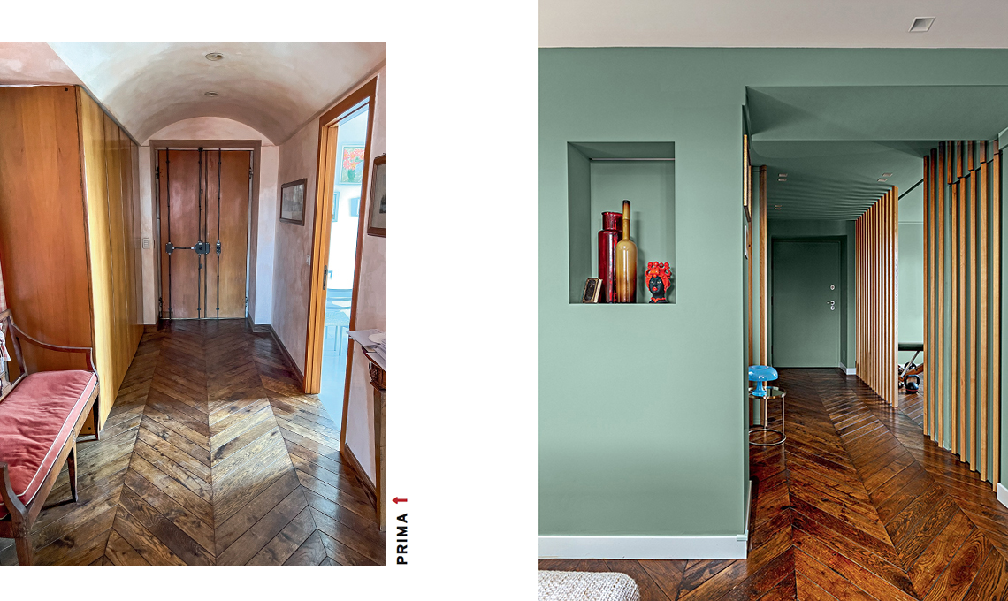 Un delicato verde salvia scelto da Isabella veste le pareti: illuminato dal bianco dei soffitti, diffonde luminosità. Gli arredi dal design minimale sono in toni neutri; il legno del parquet originale dialoga con le travi rimaste a vista e con le doghe che disegnano l’ingresso.