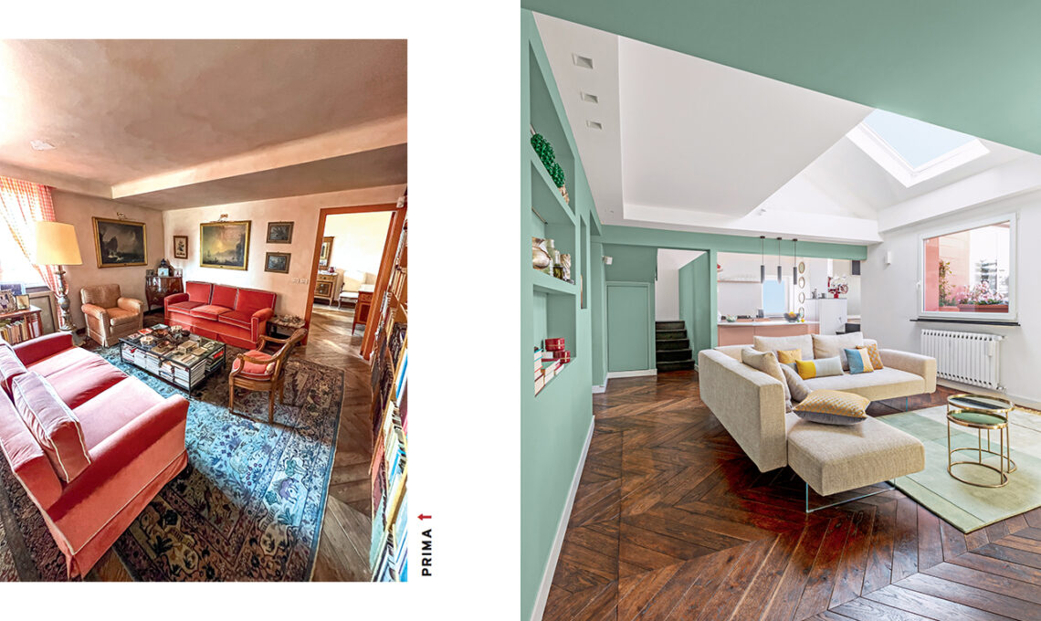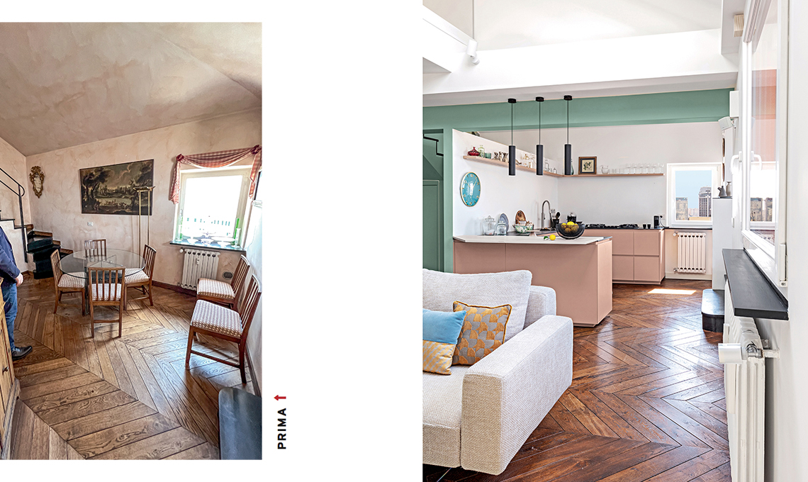 Trovato l’attico perfetto, appena ristrutturato, fanno la proposta, ma il giorno dopo la casa viene ritirata dalla vendita. «La delusione è stata presto dimenticata grazie a una nuova soluzione: la nostra casa attuale!». Nonostante i numerosi lavori da fare, gli spazi bui e affollati da arredi datati, la stanza inondata di luce affacciata sul terrazzo è risultata decisiva.