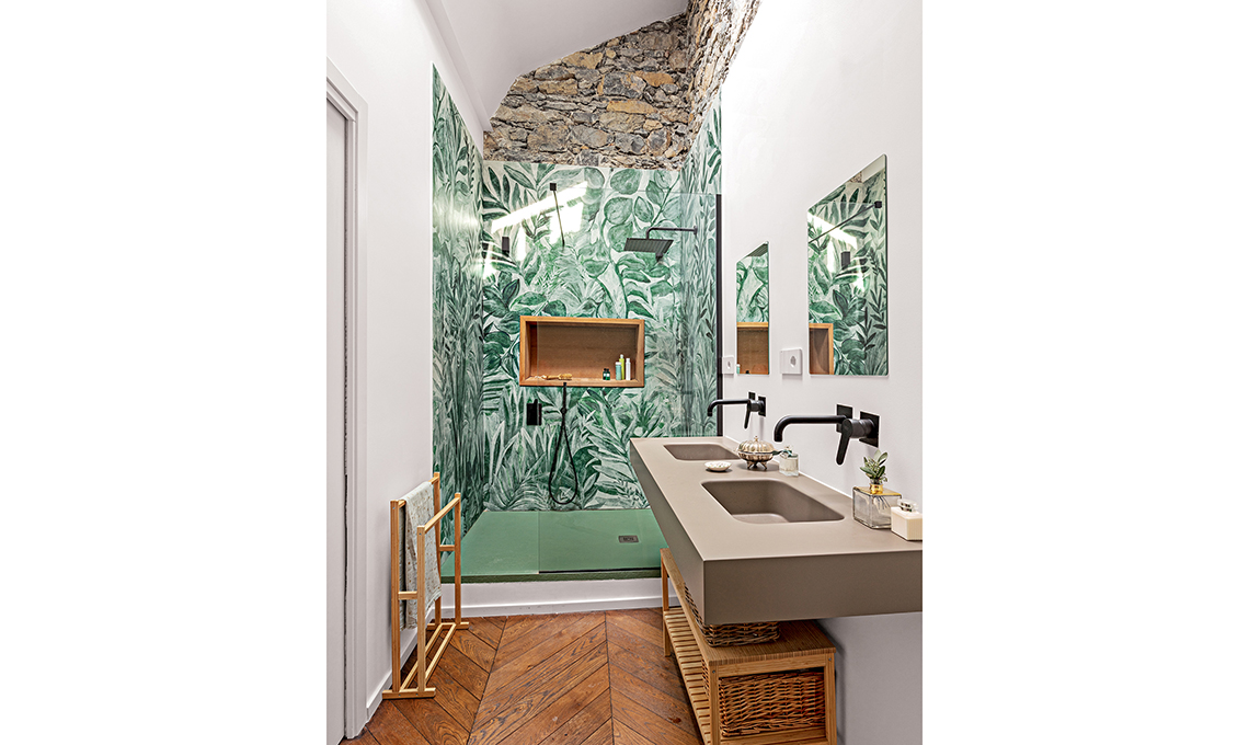 Piastrelle jungle effetto wallpaper e tracce di muro del 1870 a vista per il bagno. Piastrelle rivestimento doccia Fio.