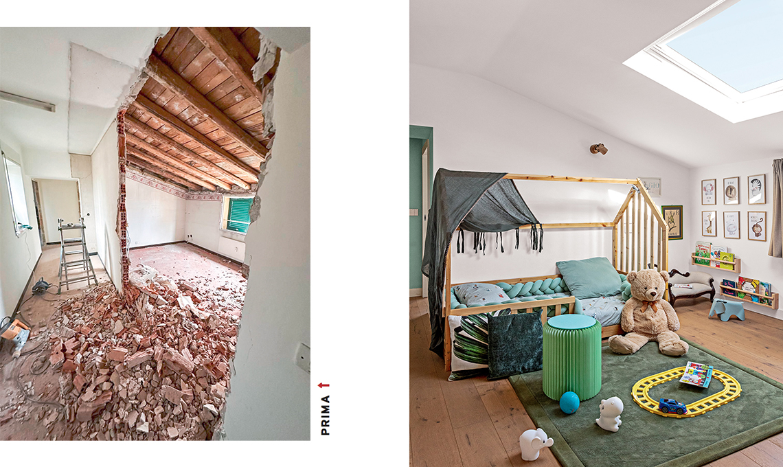 Prima la casa aveva una divisione rigida: la cucina era all’ingresso, il living separato dalla sala da pranzo da una parete, c’era solo un bagno e tutte le stanze avevano controsoffitti. «Ma noi volevamo luce!» dice Teodoro. Così i controsoffitti sono stati abbattuti, le stanze ampliate eliminando i corridoi e si sono installate finestre sul tetto, per godere al massimo della luce zenitale. Via il muro che chiudeva il living, la scala è stata spostata per lasciare spazio all’attuale cucina: ora è lei a disegnare lo spazio e a portare luce nella stanza, anche grazie alla finestra sul tetto.