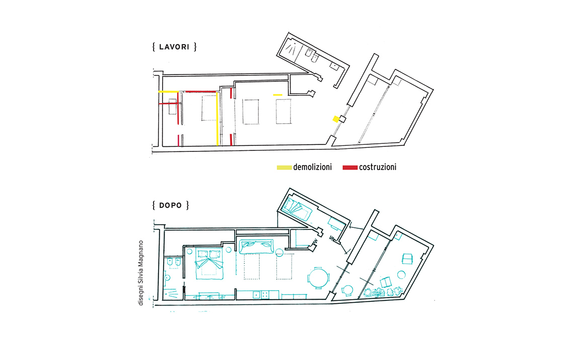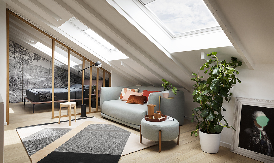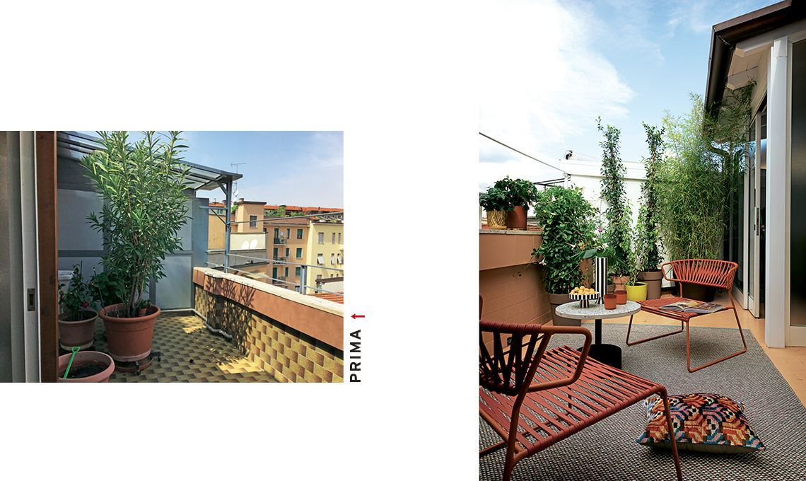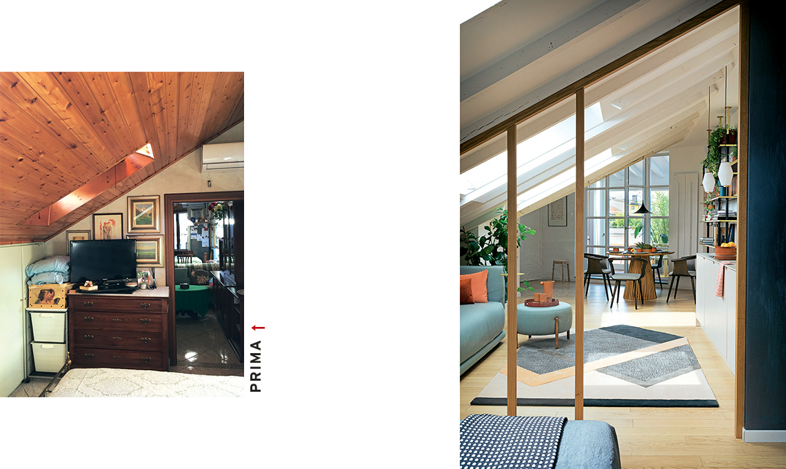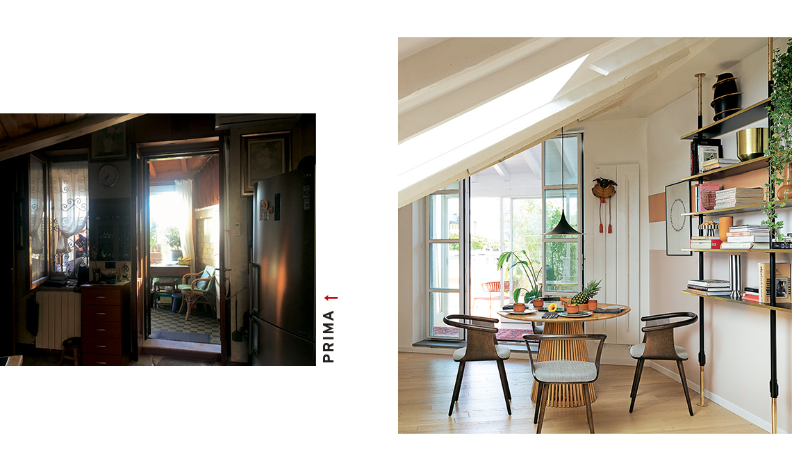 Il desiderio, mentre spulciavo annunci di mono e bilocali, era chiaro: pochi metri quadri, tanta luce; le mansarde sono ideali per questo. Con i permessi comunali abbiamo allargato le finestre sul tetto e aperto un’ampia portafinestra sul terrazzo.