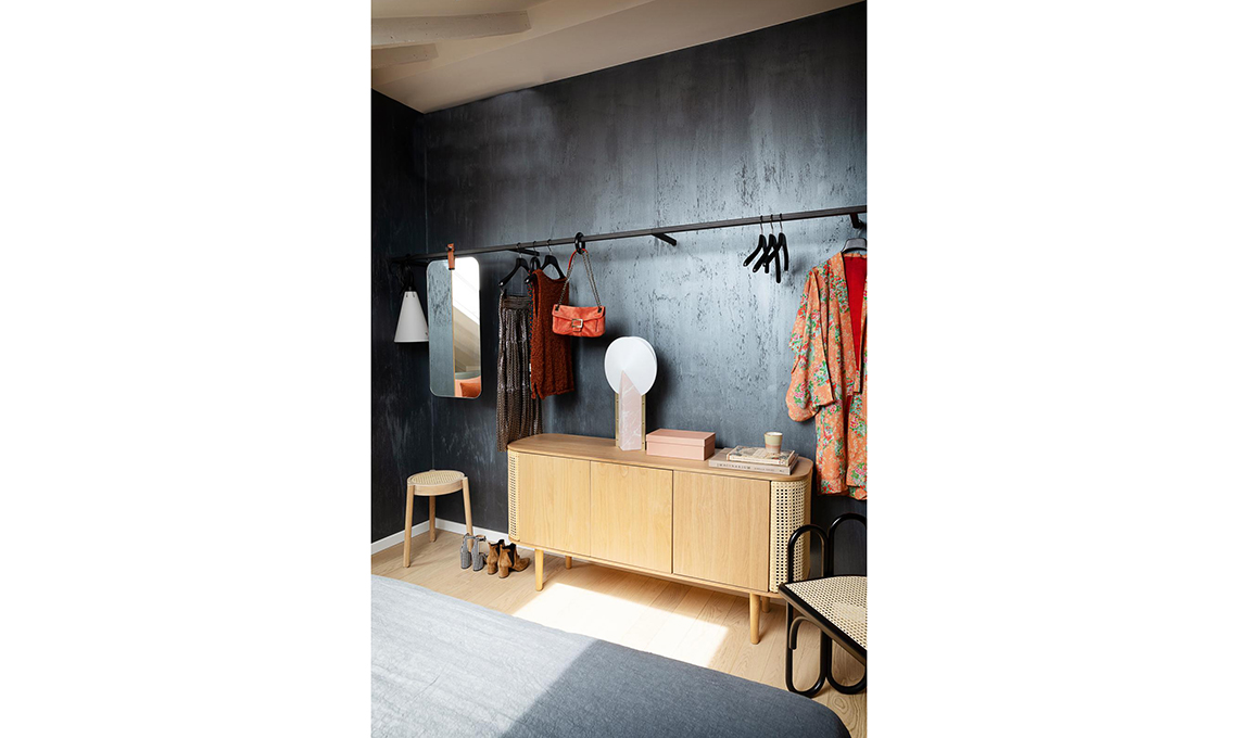 Una madia e una semplice barra appendiabiti sono una scelta insolita come guardaroba, ma sono funzionali se si pensa agli affitti brevi o all’uso in vacanza. In altre parti della casa ci sono spazi contenitore celati alla vista.