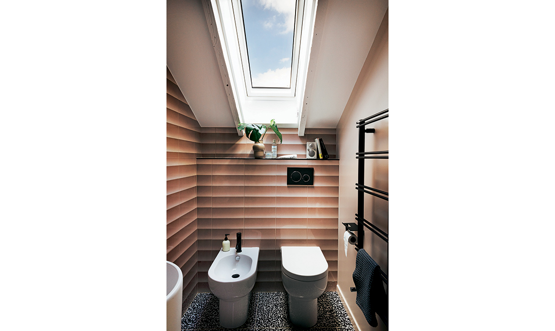 Alle pareti piastrelle Shades of Blinds rosa [Diesel per Iris Ceramica cm 30x10], a pavimento Artwork Deco_06 a terrazzo [Florim cm 80x80]. Sanitari Nuvola [Azzurra Ceramica € 329 il bidet, € 505 il vaso con sedile]. Scaldasalviette V8 nero [Antrax, cm 101,6x40 €466,04], asciugamani [Tessitura Govi].