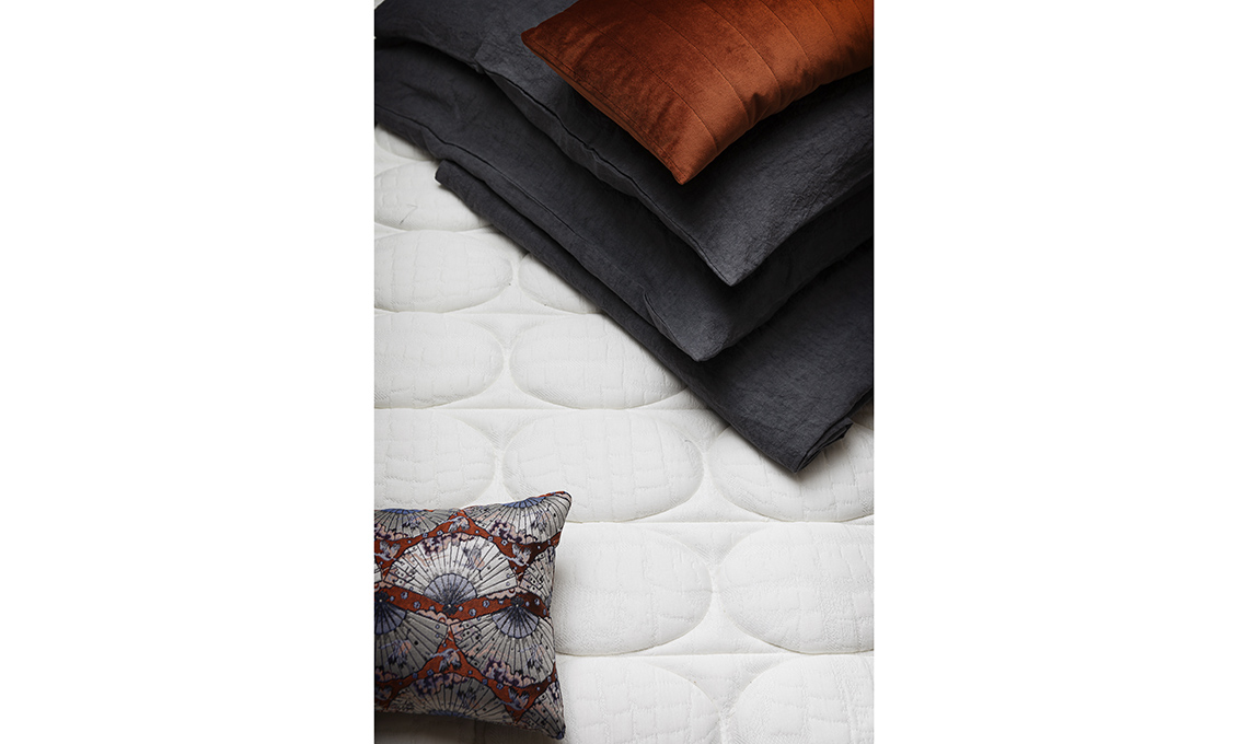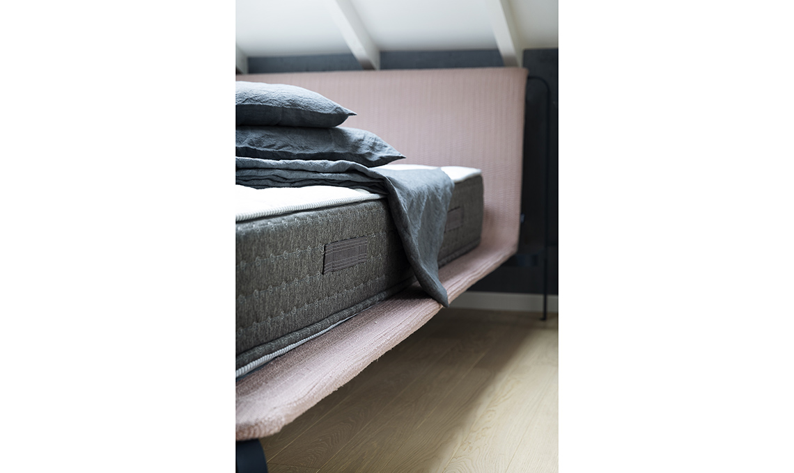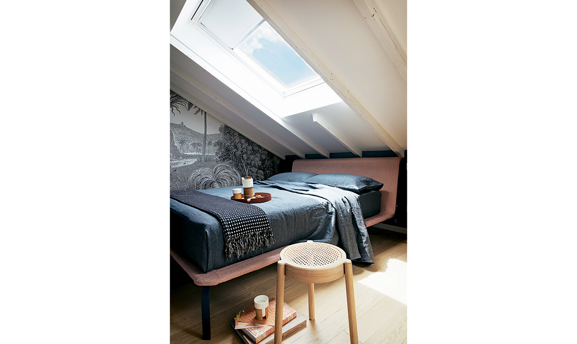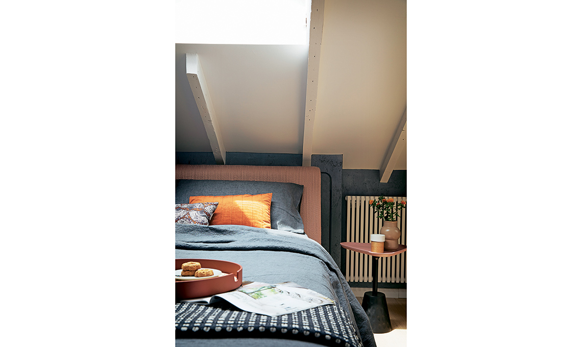 Il letto Bend in metallo blu e rivestimento rosa [Bolzan Letti, cm 194x232x92h da € 2.794] è completato da: materasso Revolution Hybrid con tecnologia Octaspring® [Perdormire, da €999 il matrimoniale], piumino D600 Classic Winter e guanciali Perla Cirmolo [DaunenStep, cm 250x200 € 689 e € 135 cad] vestiti dal set lenzuola in lino di [Tessitura Govi] più cuscini Flair [Normann Copenhagen] come il vassoio con piattino [Les Ottomans] sul plaid [Ikea]. Sul comodino da [Cantiere Bovisa], vaso [Normann Copenhagen] e tazza [Tonfisk Design]; calorifero H_2O VS a elementi verticali in bianco opaco [Antrax, cm 60x72 € 708,82].