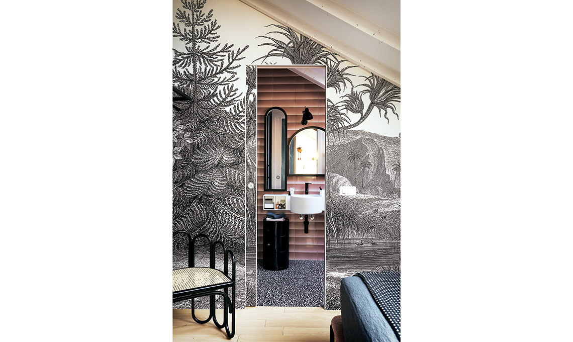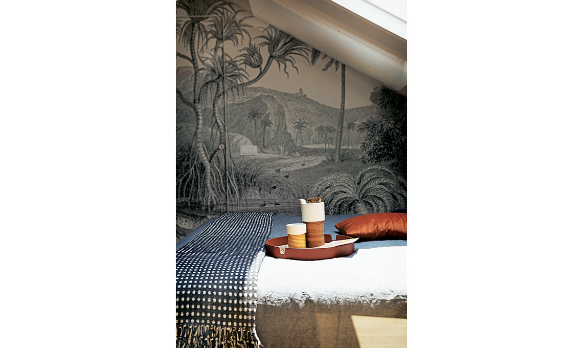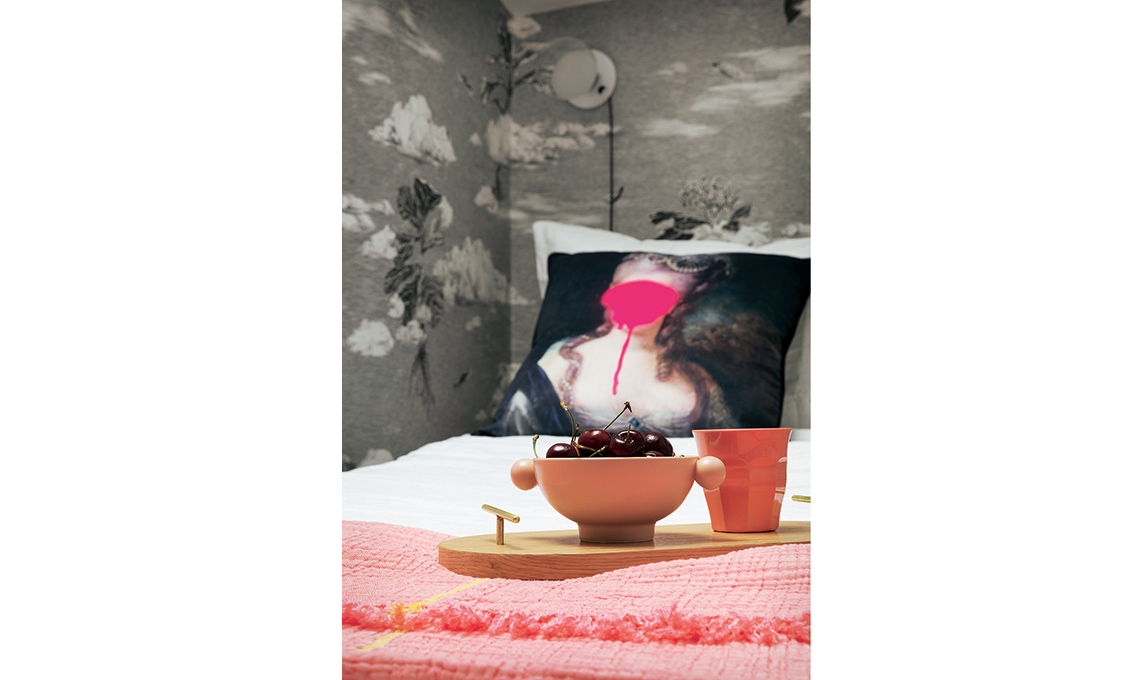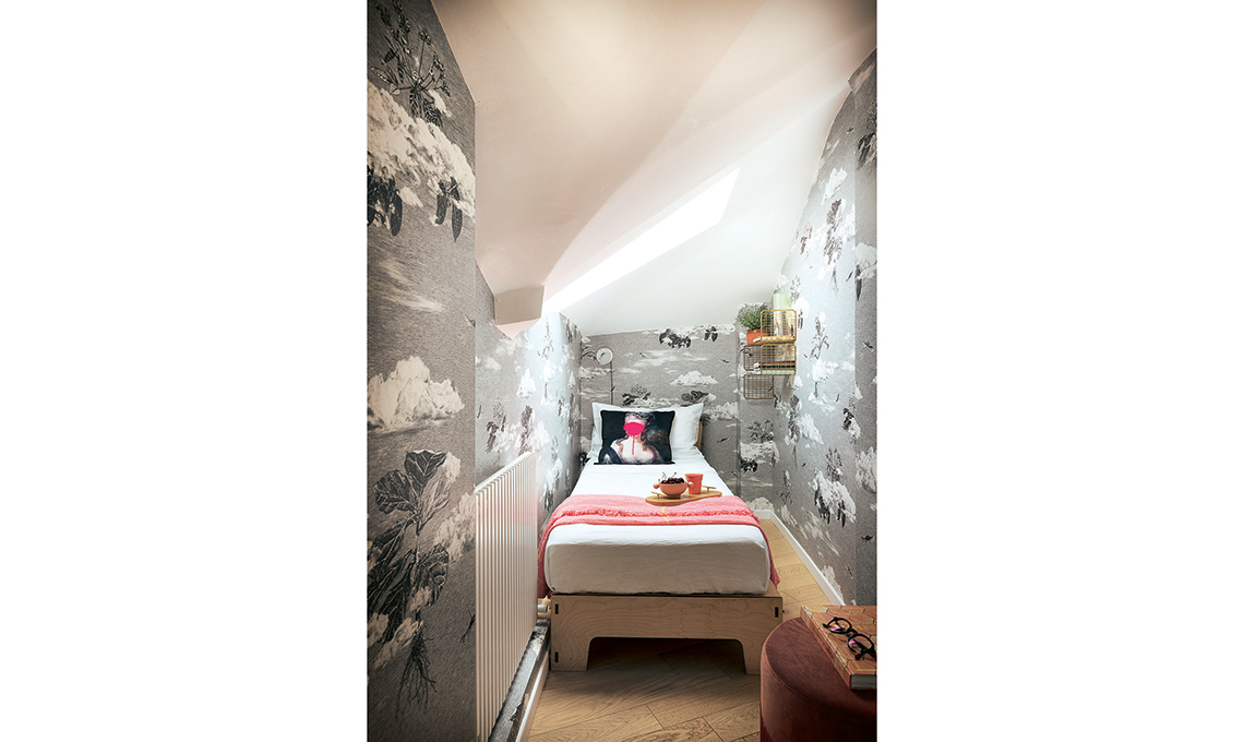 Carta da parati Autumn Cloud Forest [Sian Zeng € 217,54 il rollo da cm 68,6x10 m]; calorifero H_2O VS [Antrax]. Il letto in multistrato naturale [Onfuton, cm 80x202x26h € 270] è vestito con lenzuola Orlino in 100% lino balsamico bianco [Tessitura Govi € 322], plaid rosa [Zara Home] e cuscino d’arredo Madame Blush [Mineheart, cm 55x55 € 79,40]. Lampada Lampadina [Flos € 110], mensole Svenshult [Ikea, cm 60x20 €13 cad] con ciotola [Normann Copenhagen] e brocca [Hay].