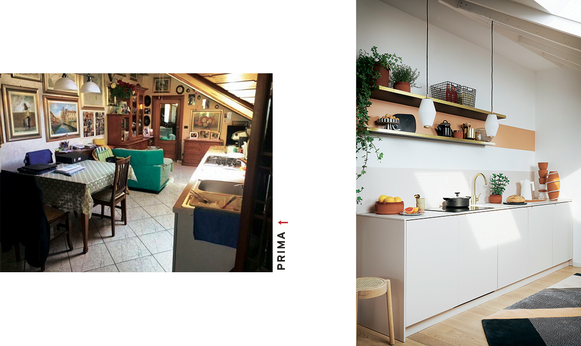Cucina realizzata su progetto [Falegnameria Fallacara] con top in grès Calacatta Oro [Florim] e rubinetto 1332 oro opaco [Treemme]. Piano a induzione 60 cm PIE611B10J [Bosch], frigorifero a incasso iQ500 [Siemens, cm 82x60]. Lampade Dahl Small [Northern € 228 cad]. Ciotola Junto [€40], tagliere e bicchieri [Normann Copenhagen], piatto [Les Ottomans], mug Venus [HKliving € 5,95 cad], pentola Artusi 2.0 [TVS], tagliere in marmo nero [H&M Home], calice [Nude Glass], vassoio in rame [Casa] con bollitore Plissé [Alessi € 89], vasi in terracotta e smalto coll. 2000 di Ugo La Pietra [Rometti da € 700]. Sulle mensole, alzatina [Oyoy € 55], caffettiera smaltata [Dexam], vaso e cestino [H&M Home].