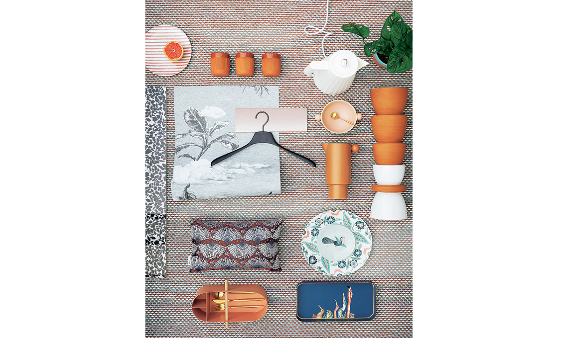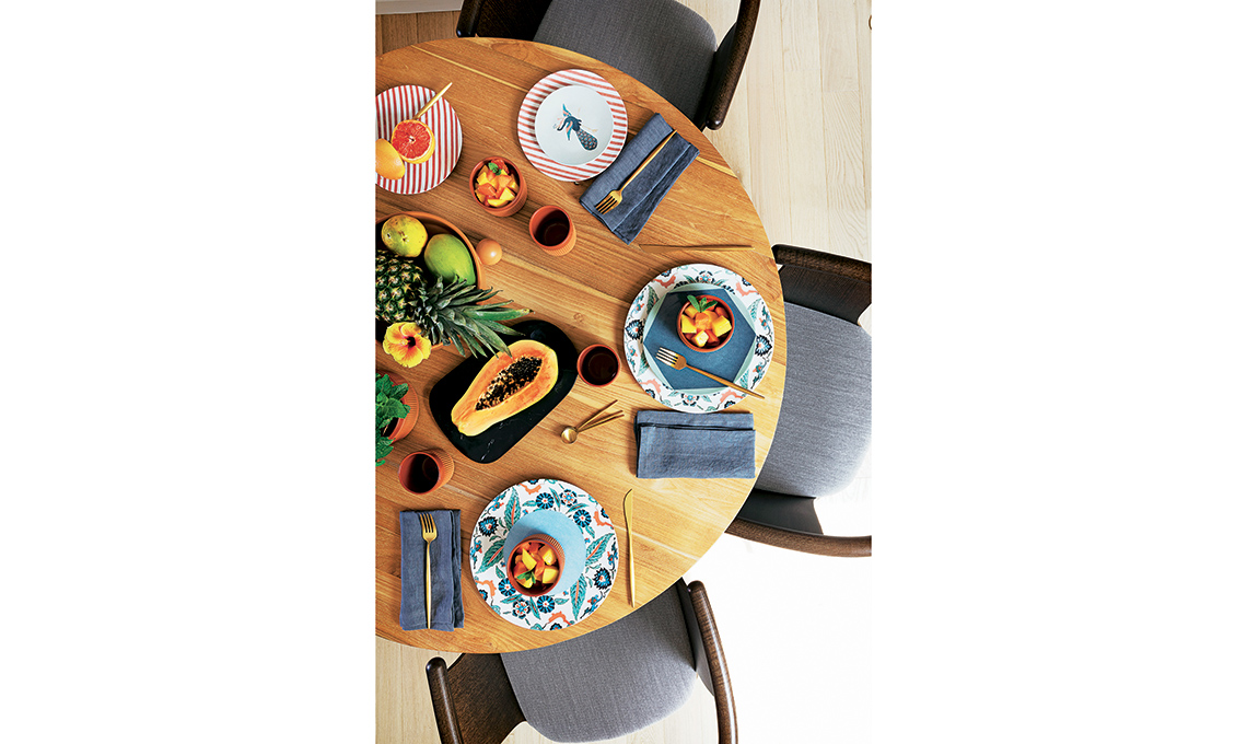 Sul tavolo: piatti Tawus a fiori, righe e con pavone [Les Ottomans, da ø cm 17 da €45 cad], coppette e bicchieri in terracotta Junto di [Normann Copenhagen da € 13 cad] come il tagliere in marmo nero Peeble [€ 78], posate in acciaio inox dorate [su Amazon], tovaglioli grigi [Tessitura Govi], centrotavola Inka Tray caramel [Oyoy € 48], cesto dorato e tagliere con il pane [H&M Home].