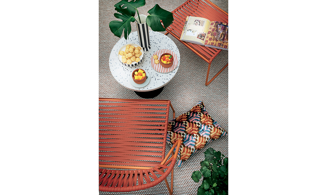 Sul tappeto in pvc Effi, resistente all’acqua e facilissimo da lavare [Pappelina, cm 180x260 € 644], poltroncine Lisa Lounge Club con gambe a slitta e nastri in pvc intrecciati, confortevoli e resistenti [Scab Design € 561,84 cad] e tavolino Delano con base in metallo e top in terrazzo grigio [Kave Home, ø cm 55x40h € 139]; cuscino Silk Velvet V379 di [Les Ottomans € 85] come piatto e piattino; ciotoline [Normann Copenhagen], alzatina e vaso Toppu a righe [Oyoy € 55 e € 68].