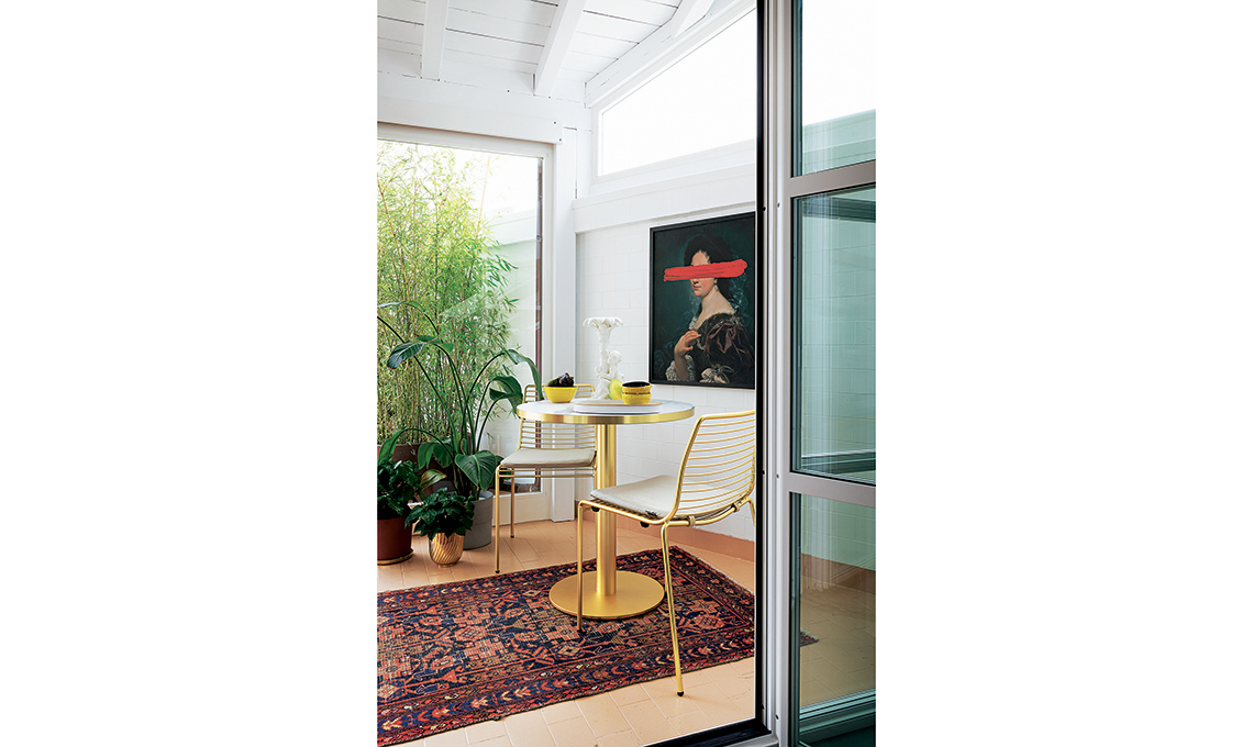 Il gioco dei dettagli color ottone torna in veranda con il tavolo Tiffany in metallo con top finitura marmo di Carrara [ø cm 70 € 261,08] e sedie Summer ottone con cuscino tortora [€ 200,65 cad] di [Scab Design], quadro Red Mark [Mineheart € 213,74], portacandela Art de la Table Mar 17 di [Les Ottomans € 288] come il vassoio, ciotole gialle [Bifranci Ceramica da € 18 cad]. Serramento composto da profilo W75 TB e doppio vetrocamera, per super prestazioni energetiche e di sicurezza [Mogs, prezzo su progetto]. Il tocco di stile lo danno il tappeto di famiglia e un ritratto ironico...