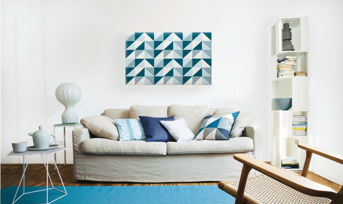 Una palette fredda contrariamente a quanto si pensi, se abbinata al bianco, dona calore a un ambiente molto luminoso. Per questo, sul nuovo divano écru, con il quale Manuela ha sostituito quello antracite, Vanessa ha voluto sistemare alcuni cuscini che, nel disegno e nelle tonalità, riprendono il quadro sulla parete e i tappeti a terra. In più, per completare la zona conversazione la nostra stylist ha inserito una libreria a colonna nell’angolo e due tavolini in metallo, il tutto dallo spiccato design geometrico con giochi di pieni e vuoti che danno carattere all’ambiente e ben contrastano con l’accogliente profilo di sofà e poltrona.