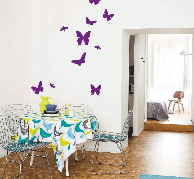 Uccellini e farfalle sul tavolo e sul muro sono stati scelti da Vanessa per dare un tocco di leggerezza e freschezza all’angolo pranzo, arredato solo con elementi dal design pulito ed essenziale. Come si vede nelle immagini, i colori scuri delle sedute e la forma rettangolare del tavolo di prima rendevano l’ambiente angusto e buio. Ora gli azzurri, i blu e i gialli di ceramiche e tovaglia, assieme alla linea tondeggiante di tavolo e sedie, creano una piacevole atmosfera intima e conviviale allo stesso tempo. E che dire del poetico volo di farfalle al posto delle ‘rigide’ stampe?