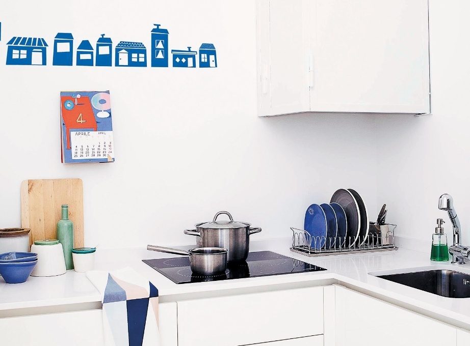 W l’essenzialità che, in cucina, è sinonimo di pulizia. Date le dimensioni ristrette della zona cottura, Manuela ha eliminato i vecchi mobili e accessori, fin troppo ingombranti e disordinati, e li ha sostituiti con una composizione angolare in laccato bianco lucido con top in vetro, sempre bianco, nel quale ha incassato lavello e piano cottura a induzione. Il frigo freestanding è stato sostituito con un modello sottopiano, così sul top c’è più posto per lavorare e tenere a portata di mano piatti, utensili e barattoli, scelti da Vanessa in nuance con il resto della casa. Il tocco in più? Togliere tutti i pensili (per una casa ad affitto breve non servono) e installarne uno solo, che serve per celare la caldaia. L’idea décor semplice ma efficace: una fila di stickers a forma di casette bene allineate, come se fossero su una mensola.