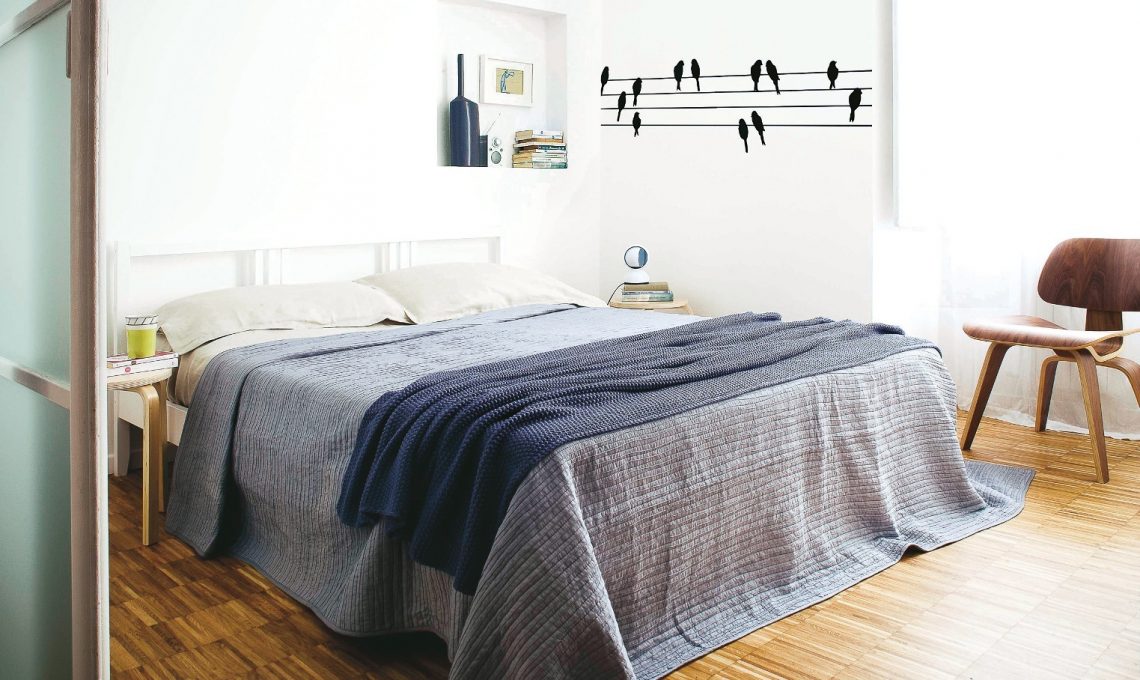 La fondamentale cura nella scelta dei dettagli fa sentire proprio anche un ambiente nel quale si vive per pochi giorni. Per questo, Vanessa ha voluto vestire il letto con lenzuola, copriletto e plaid in tessuti morbidi e materici in tonalità minimali ma avvolgenti che vanno dal corda al blu. Manuela, dal canto suo, ha dipinto di bianco il letto e ha optato per una seduta di design coordinata, nell’essenza, al parquet. La nicchia è stata ‘ripulita’: al posto del quadro multicolor, Vanessa ha inserito una piccola stampa incorniciata, dei libri e una bottiglia-scultura. E sulla parete? Dei romantici uccellini appollaiati come note musicali su un pentagramma.