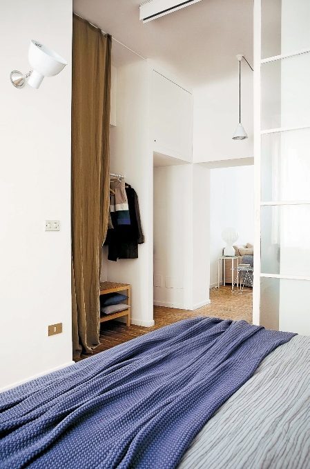 Prima, nel mini-ingresso c’erano portaombrelli, attaccapanni e scarpiera... decisamente troppo! Così, tolto tutto, anche il piccolo armadio con ante scorrevoli, è stata creata una pratica cabina armadio attrezzata semplicemente con un tubo appendiabiti, delle panche a ripiani e una cassettiera. Per chiuderla? Una tenda a tutta altezza in un caldo color nocciola. In più, una quinta scorrevole in vetro satin isola la camera da letto ma lascia filtrare la luce.