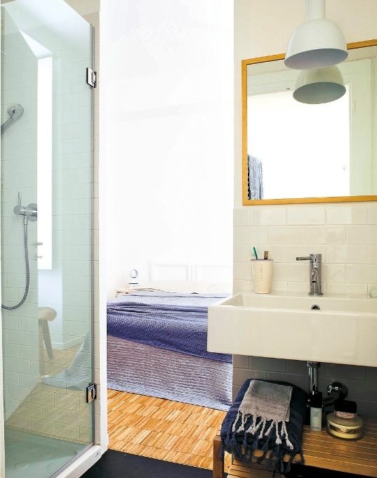 Le dimensioni, davvero contenute, del locale non consentivano grandi modifiche, ma anche qui, il total white scelto da Manuela ha donato luce e ampliato visivamente l’ambiente. Quindi, le piastrelle verdi opprimenti sono state sostituite da mattonelle in ceramica bianca, il lavamani da un lavabo ampio e squadrato, il box doccia in plastica da un’anta in cristallo trasparente. Vanessa ha pensato ai complementi in pendant con il parquet e ai tessili in nuance con quelli della camera... perfetto, no?
