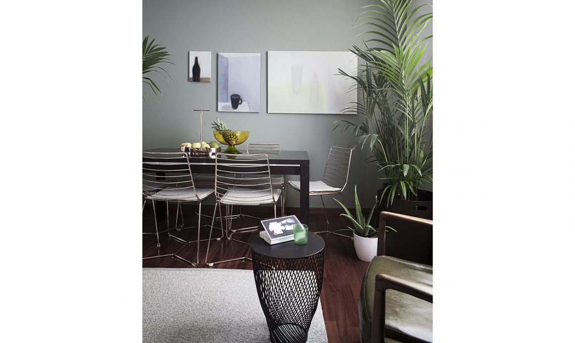 I due divani hanno nuove fodere bianche, il tavolo scuro è contornato con sedie in rame scintillante, tutt’attorno il verde delle pareti, dei tessili e delle piante che serve da trait d’union tra dentro e fuori: ora sì che c’è personalità!