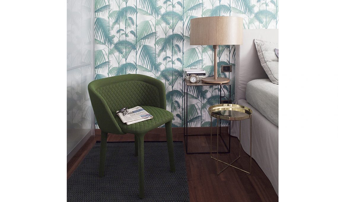 Per dare personalità alla parete dietro il letto è stata posata la tappezzeria Palm Jungle Contemporary Restyled [Cole & Son, m 10x52 cm €165]. Sul letto, copripiumino e federe [Marina C.] più plaid Nettare [Fazzini €109]; cuscini con tessuti [Designers Guild].