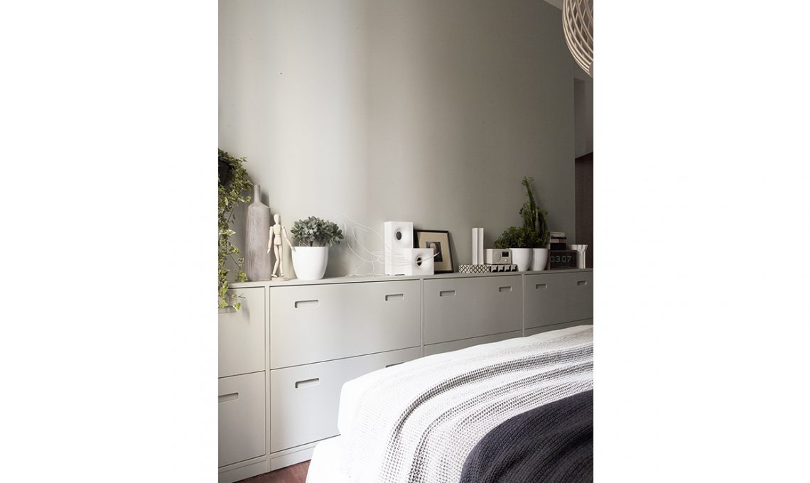 Per la collezione di scarpe del padrone di casa è stata disegnata una scarpiera su misura che occupa in lunghezza tutta la parete davanti al letto. Per renderla poco invasiva, è stata dipinta nella stessa sfumatura del muro: in pratica ora sembra una boiserie sul cui piano di appoggio trovano posto libri, piante e oggetti. Ma il ‘tocco wow’ è la tappezzeria a tema jungle che con le sue palme ‘invade’ la stanza rendendola unica e riproponendo il mood vegetale della casa.