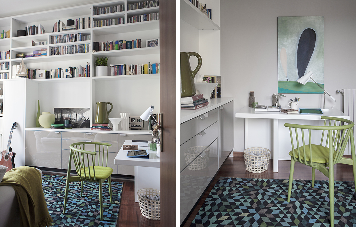 Per fare ordine nello studio è stata realizzata una libreria a tutta parete su misura [Falegnameria Fallacara] intorno a un mobile che il proprietario voleva conservare. La scrivania Atrium [Zeus Noto, cm 120x60x72h €1.174] è abbinata alla sedia Tivoli [L’Abbate €582]; sul top, caraffa fumé [Lsa International], lampada Birdy [Northern Lighting]. Cesto Gaddis [Ikea €5,99], caraffa [Coincasa].
