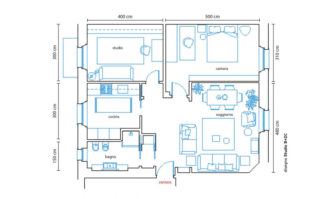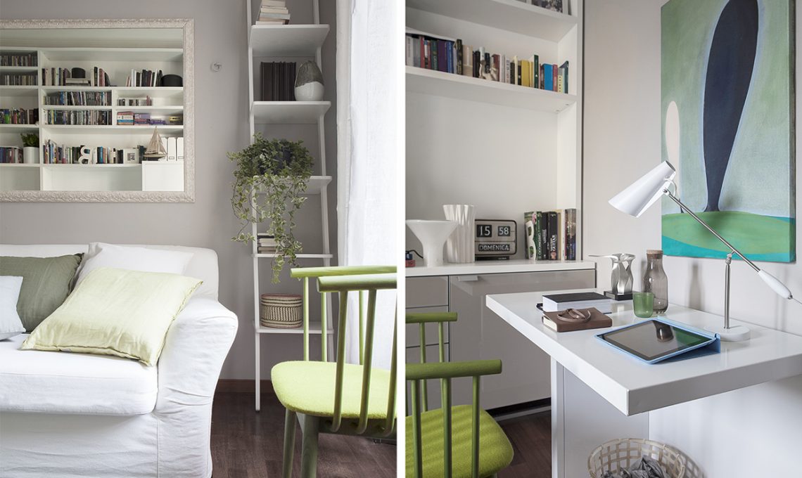 La seconda camera è usata come studio e stanza per gli ospiti. Vanessa ha disegnato una libreria a tutta parete che inglobasse anche la madia, che prima era in soggiorno, e l’ha fatta realizzare da un falegname (c’è perfino un vano chiuso per i vestiti).