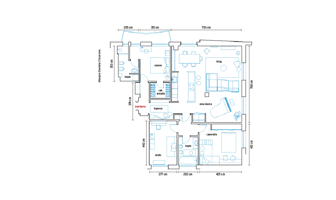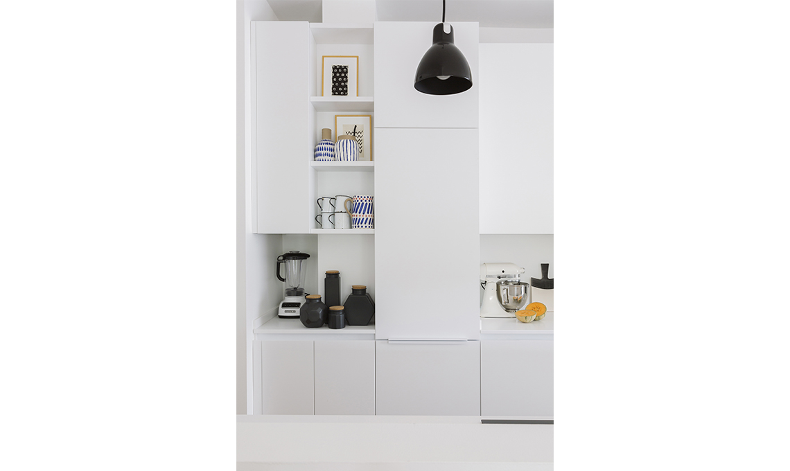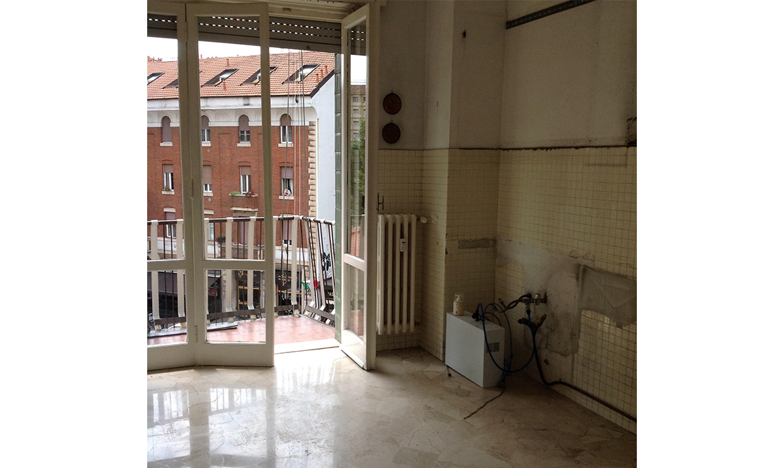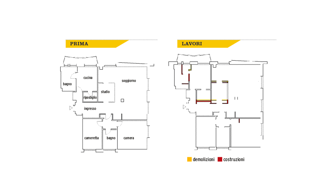 L’appartamento aveva la tipica struttura Anni ’60: cucina e bagno di servizio all’ingresso, soggiorno con studio fronte strada, zona notte sull’interno. La necessità di avere un stanza jolly (studio e camera ospiti) e il desiderio di una cucina a vista hanno suggerito una parziale rivoluzione dei locali. La camera padronale con cabina armadio (l’ex ripostiglio ingrandito) e bagno privato ha preso il posto della