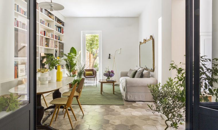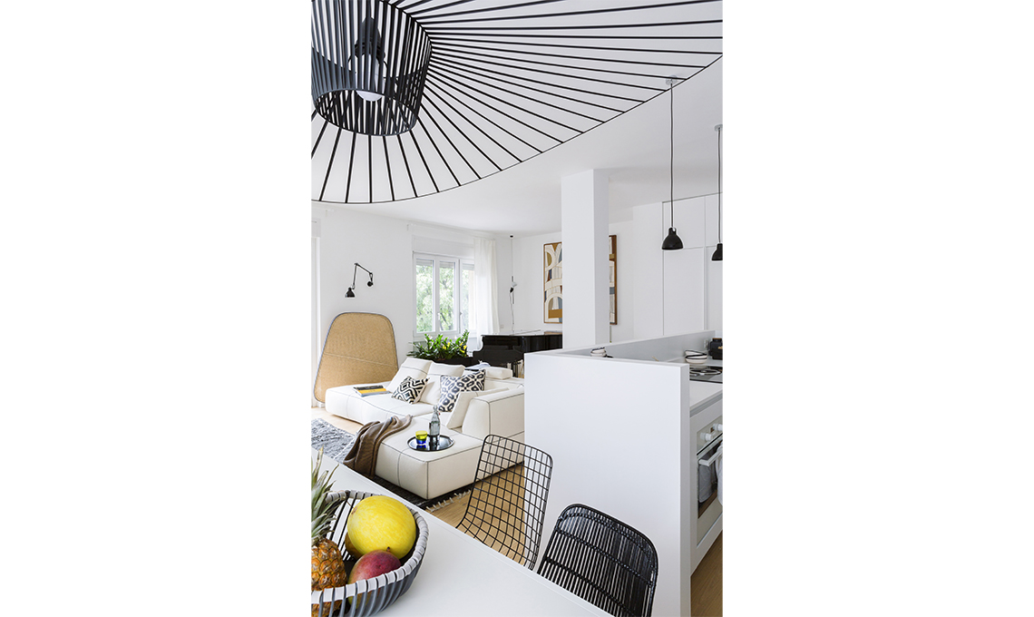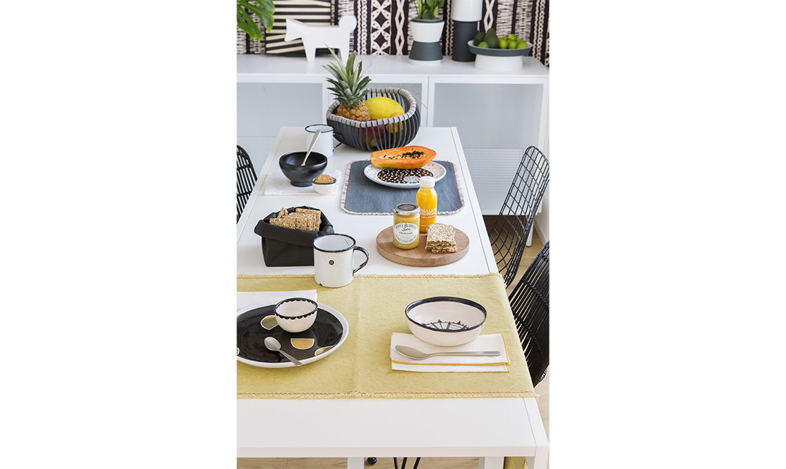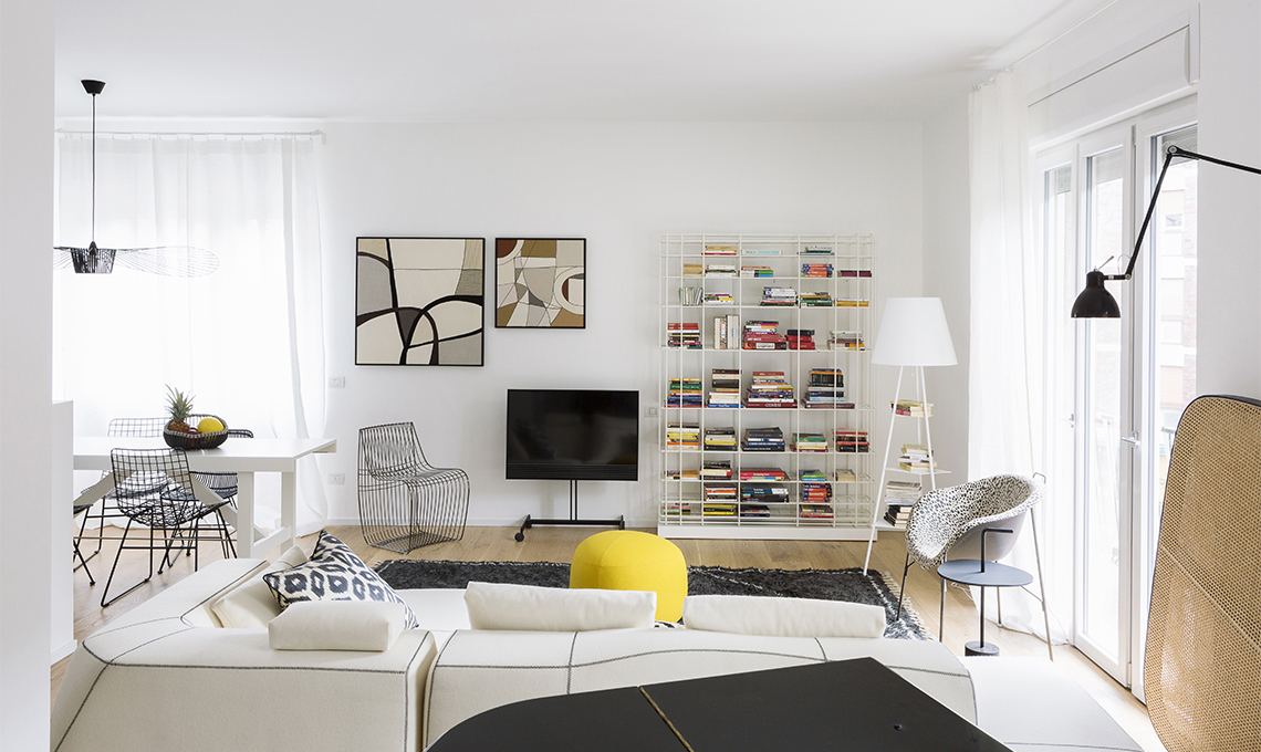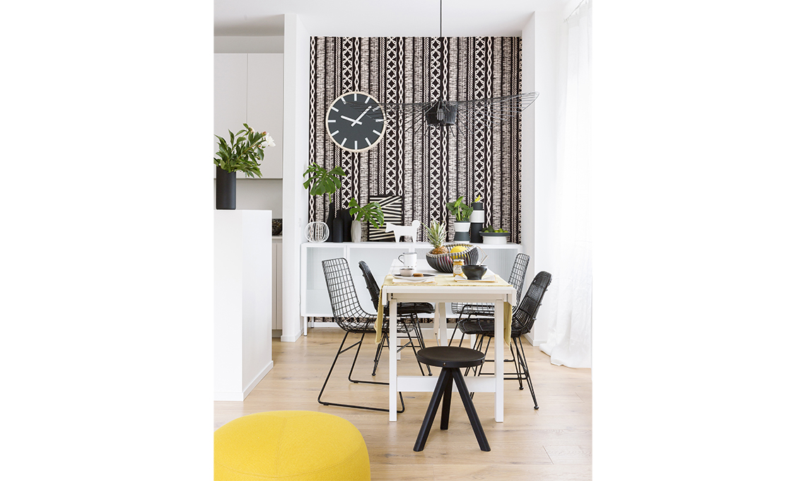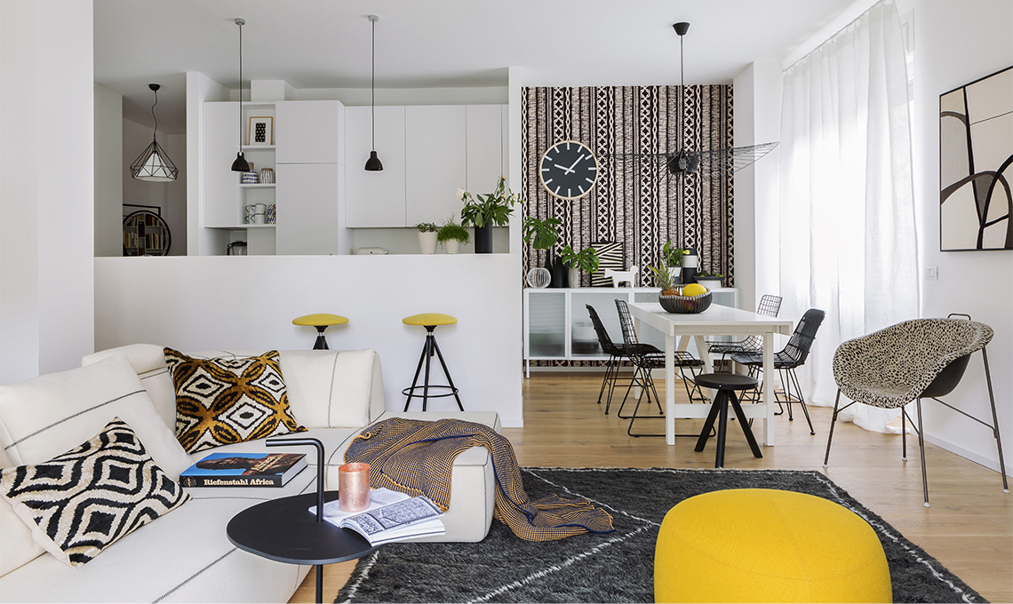 Il segreto di questo soggiorno-pranzo contemporaneo e dal sapore etno-chic sono i tocchi di giallo. Scaldano il bianco e nero e sprigionano energia. L’angolo lettura è organizzato con la poltrona Eu/phoria [Eumenes €540] rivestita in tessuto Terra Vaalbara [Alcantara®], la lampada da terra Tribeca con ripiani [Mogg, cm 50x50x170h €838] e la libreria Leyva in tondino di ferro verniciato [Saba Italia, cm 150x30x210h €2.412]. Finestre Prolux Evolution [Oknoplast].
