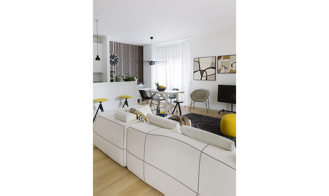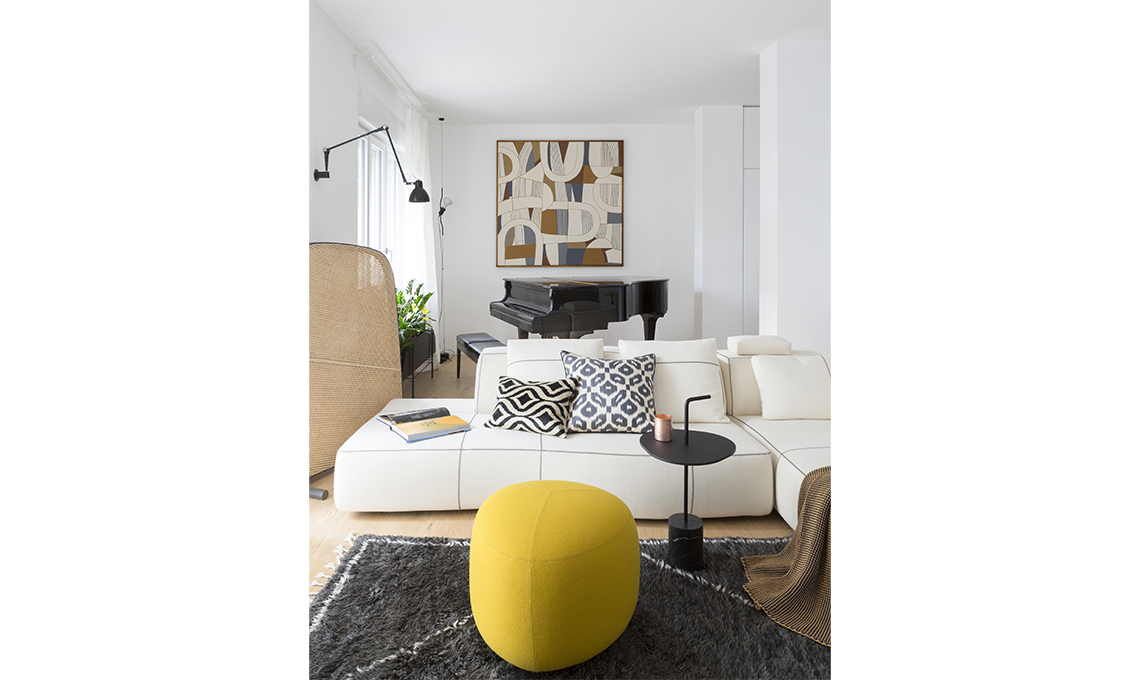 Sul divano bianco Bend [B&B Italia] ci sono cuscini etnici [Les Ottomans da €55 cad] e plaid di [J&V Store €100]; a contrasto il pouf giallo Kipu
