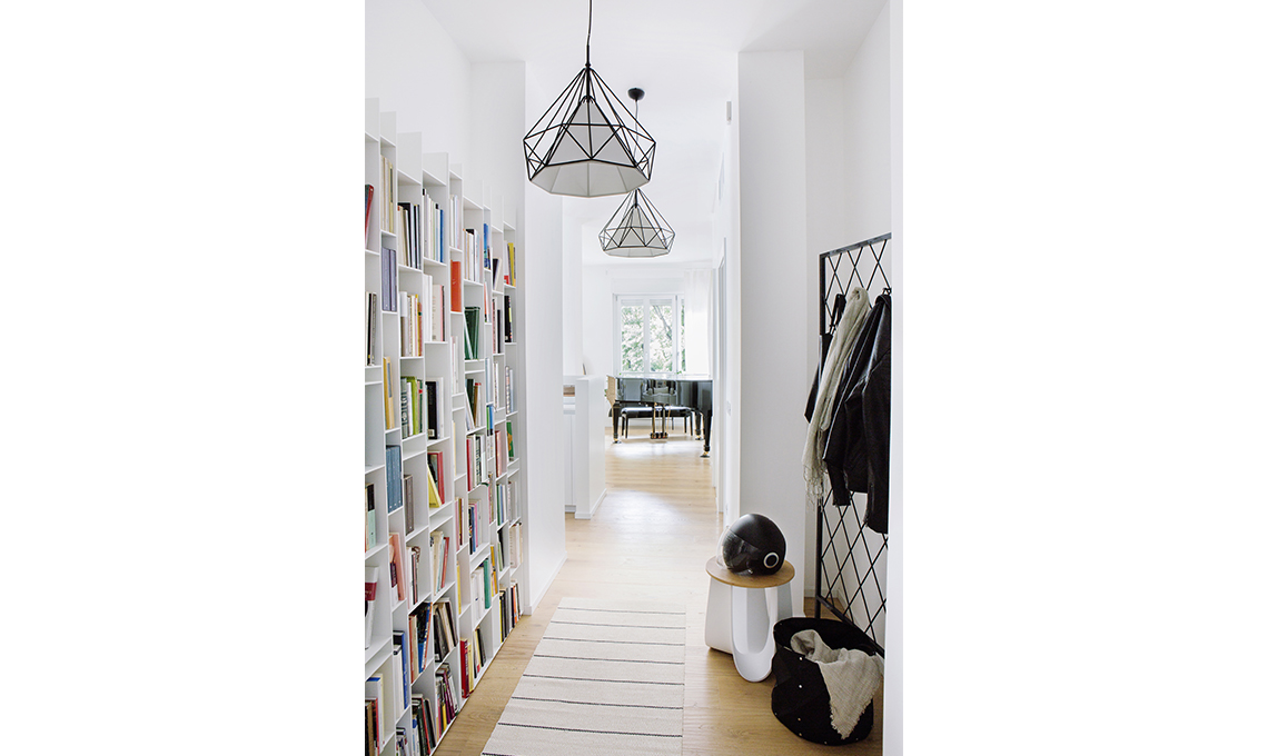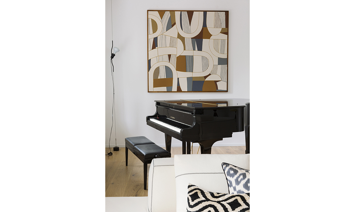 La vista dalla porta di ingresso corre direttamente sul pianoforte a coda della padrona di casa. Librerie Random di [Mdf Italia] come il tavolino-sgabello Sag.